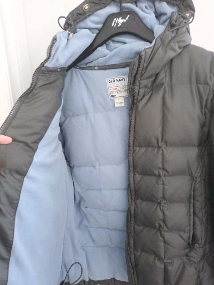 Dark grey puffer jacket. Size large. Features a hood with light blue fleece lining. Zipper closure. Excellent for cold weather.