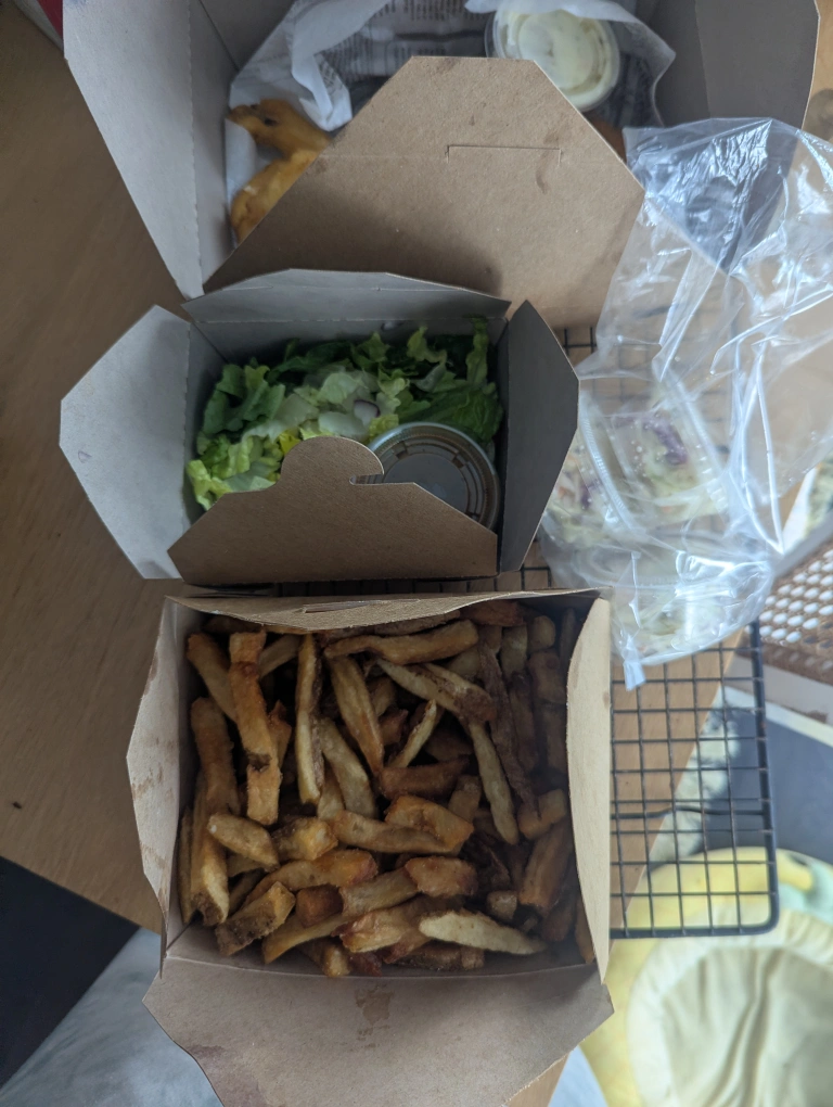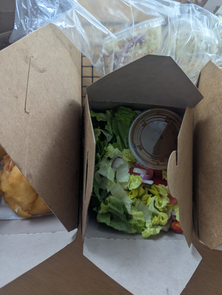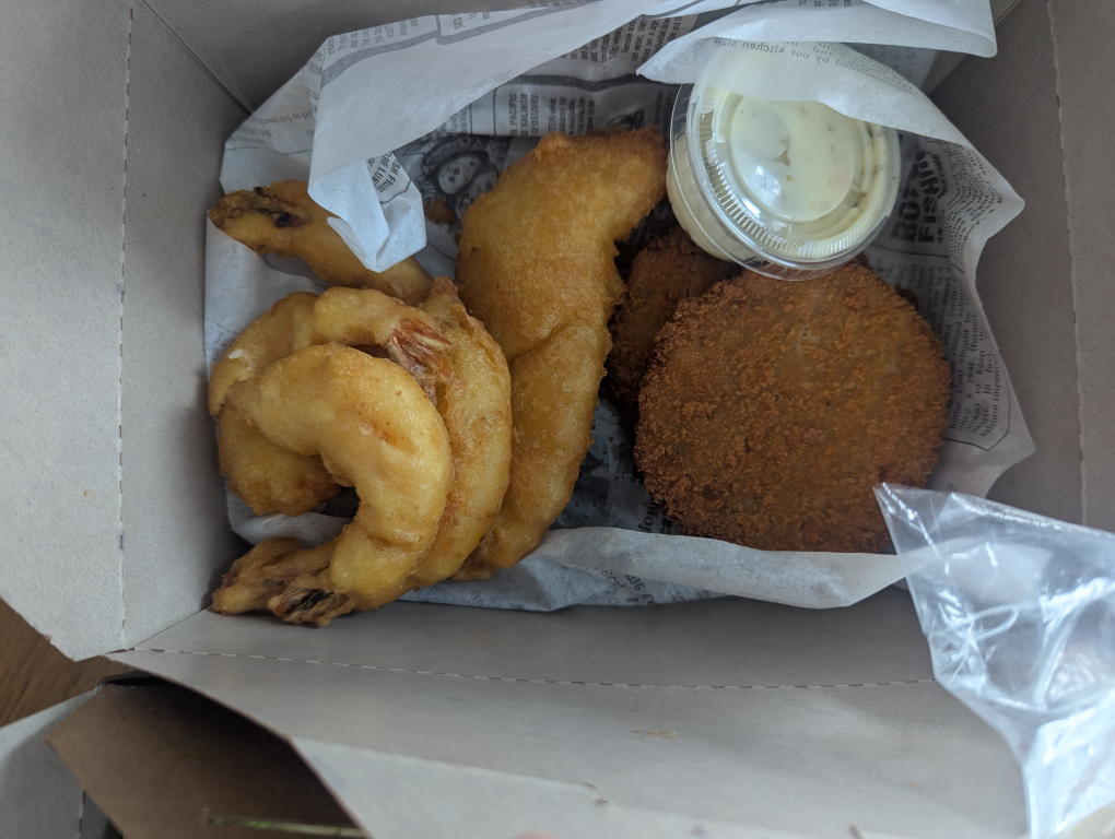 Includes fried fish, shrimp, and a fish cake. Also comes with fries and a side salad with dressing. Everything is in individual takeout containers. Delicious food just dont want it to go to waste!