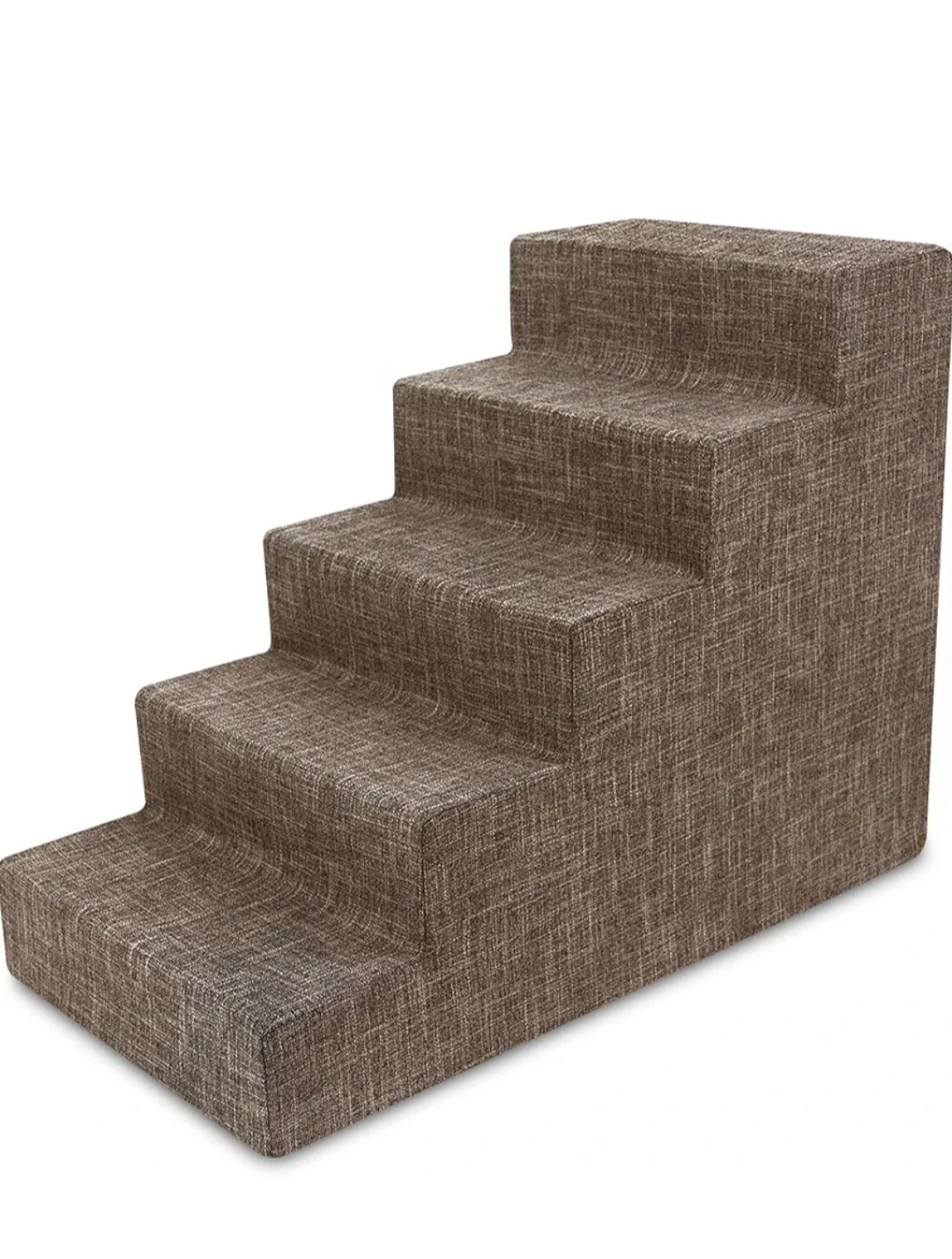 Five step foam pet stairs. Removable and washable Brown linen cover. Holds up to 100 pounds.
