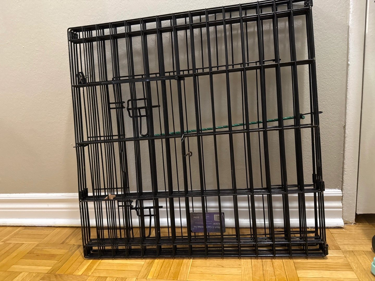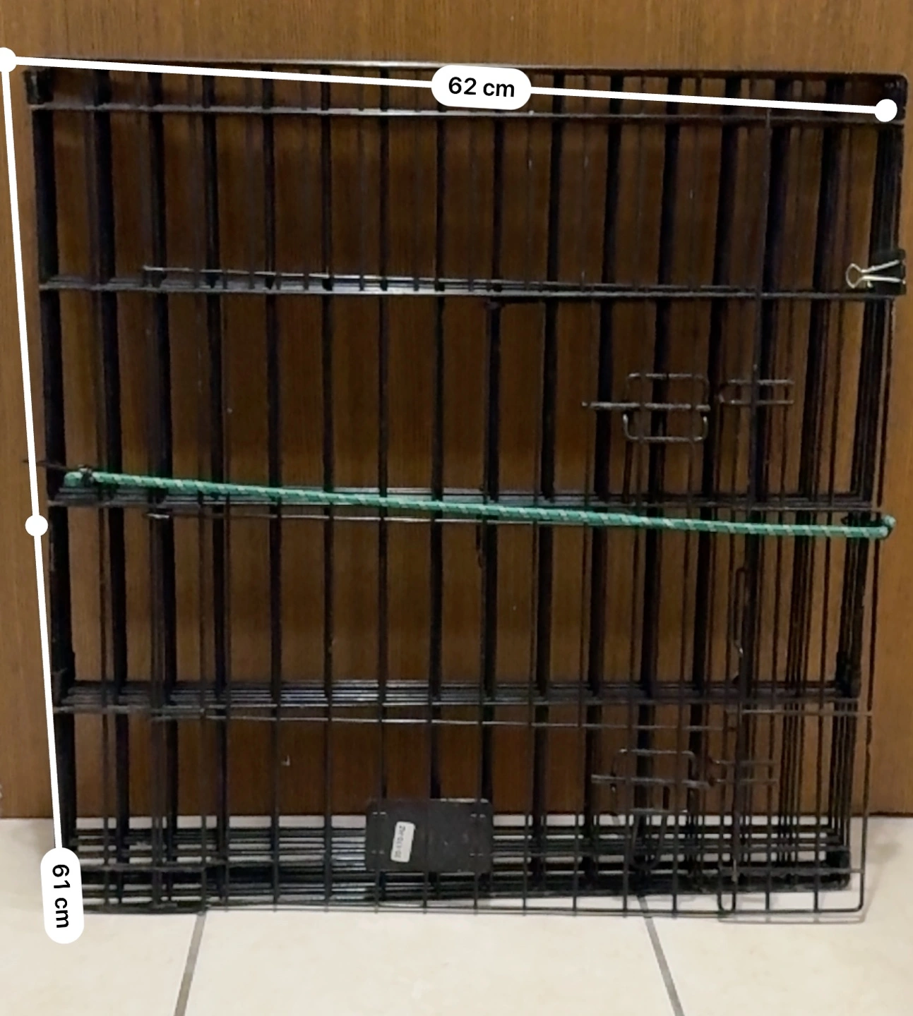 Foldable metal dog crate panel. Black finish. Measures approximately 61cm x 62cm. Good for small to medium dogs. Some minor wear. (8x square metal)