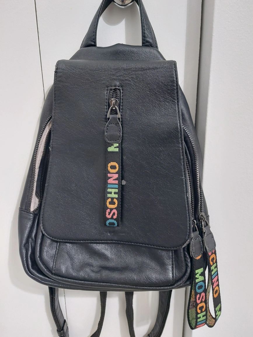 919Small black leather backpack. Features a main compartment and zipper closure. Two smaller pockets on the front. Adjustable straps. Excellent for everyday use.
