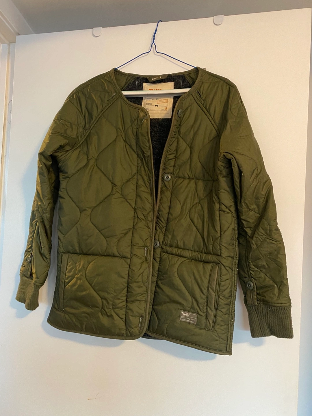 Olive green quilted jacket. Button front. Size small. Ribbed cuffs. Warm lining. A winter product. All season protection.