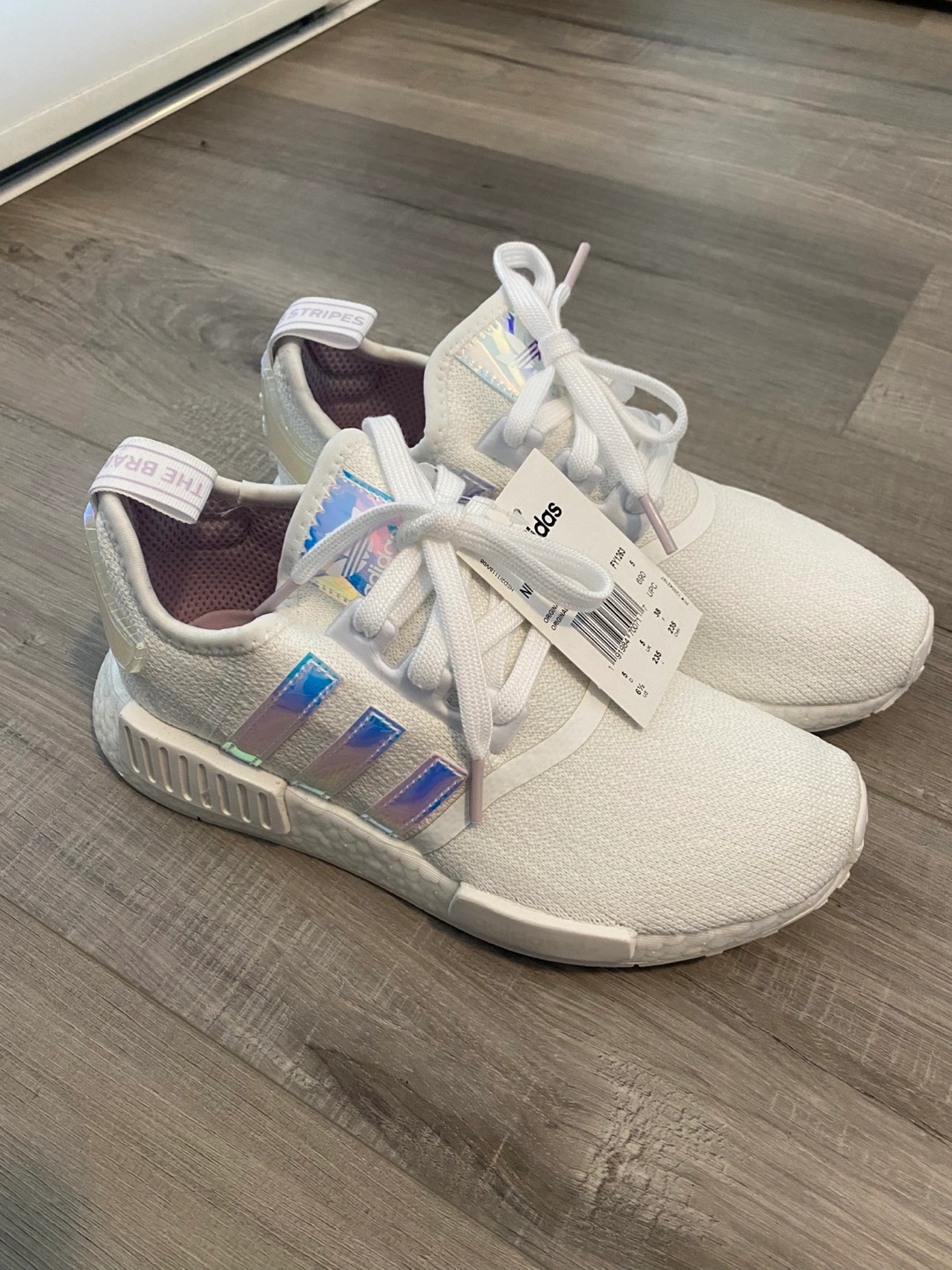 Women's Adidas NMD_R1 sneakers. White colourway with iridescent detailing. Size 7. New with tags.