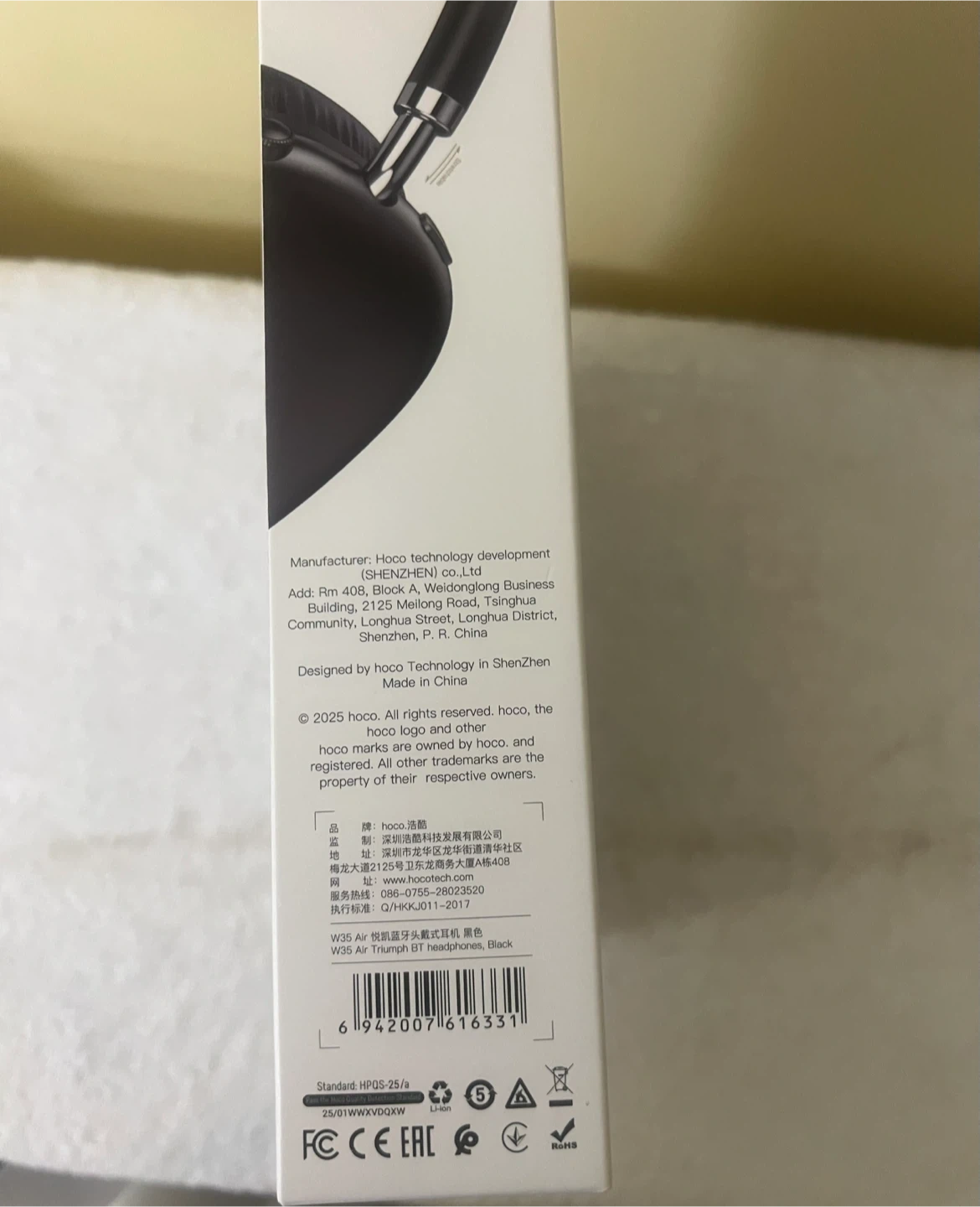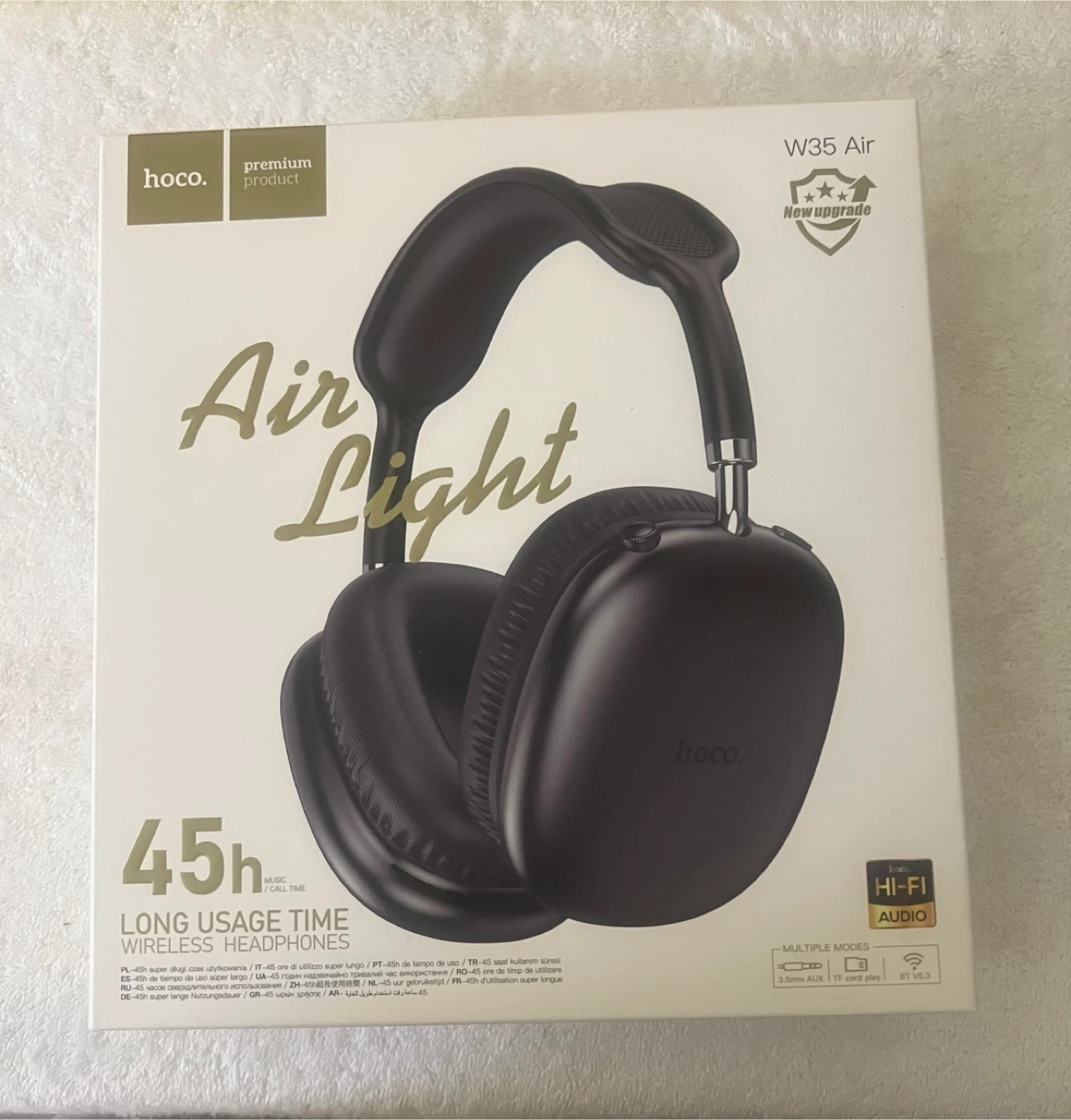 Hoco W35 Air wireless headphones in black. These headphones boast a 45-hour long usage time and support TF card, AUX, and Bluetooth 5.3. They come with a USB-C charging port for convenient power. The comfortable design is suitable for long wear.