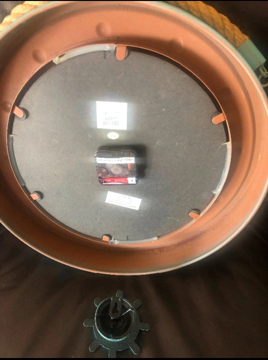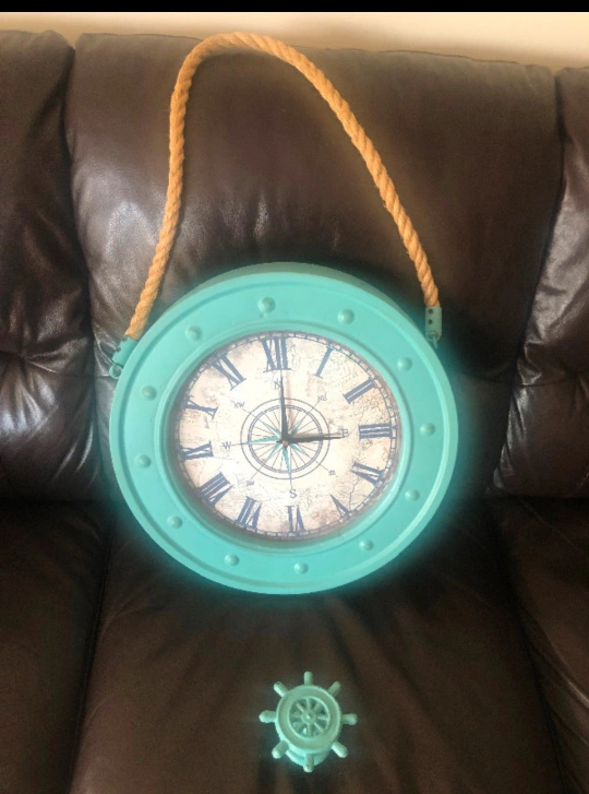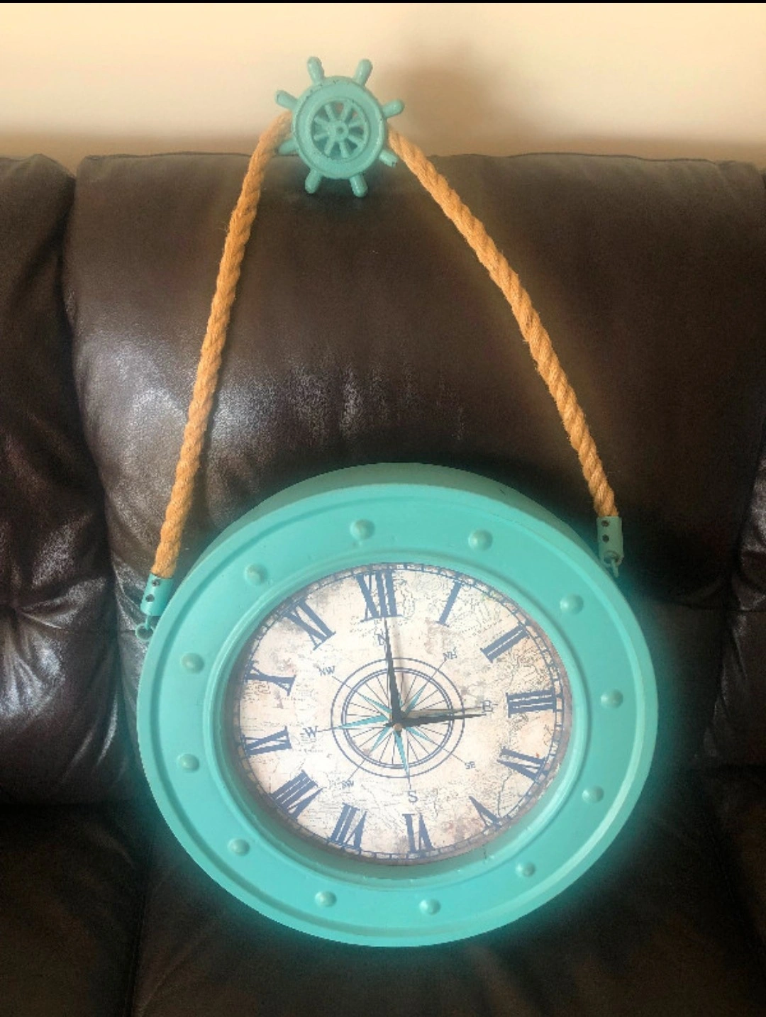 Unique teal coloured wall clock. Features a nautical design, compass, and rope accents. Includes a small ship's wheel.