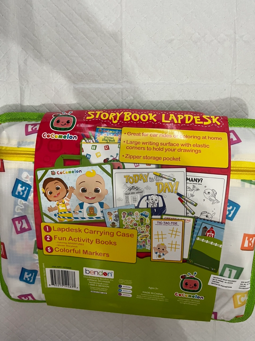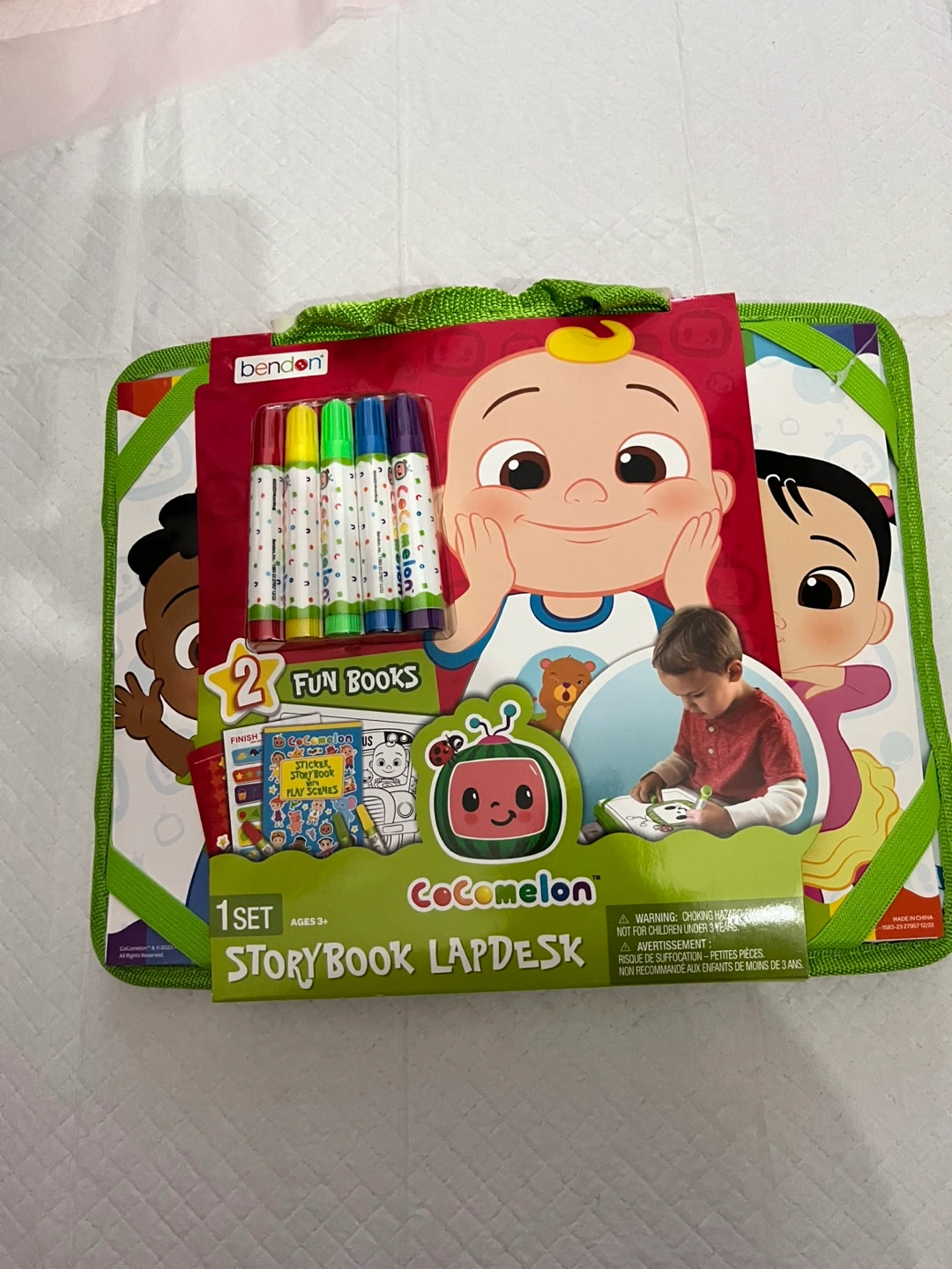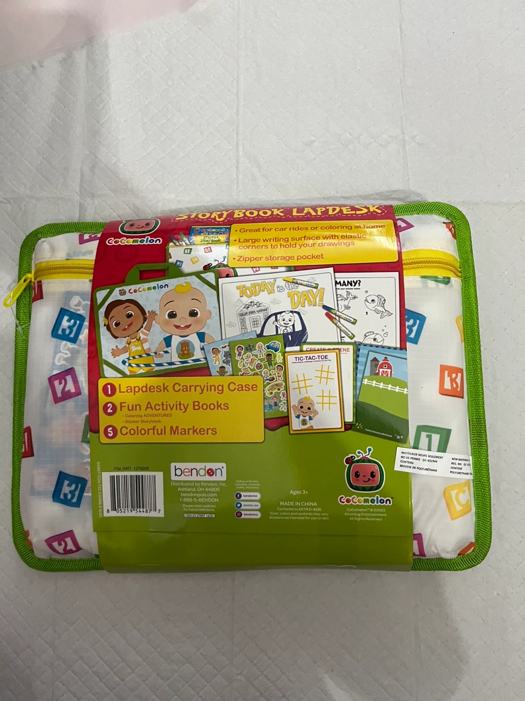 Cocomelon JJ Portable lapdesk, includes two activity books (which also doubles as a carrying case with storage pocket) and five markers. Great for car rides or colouring at home. Features a large writing surface with elastic corners to hold your drawings and a zipper storage pocket.