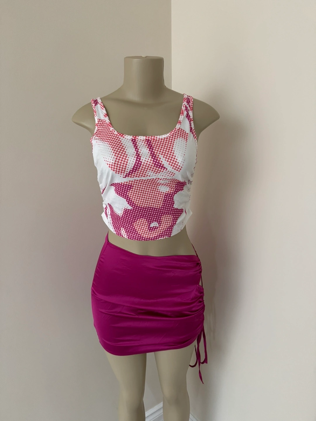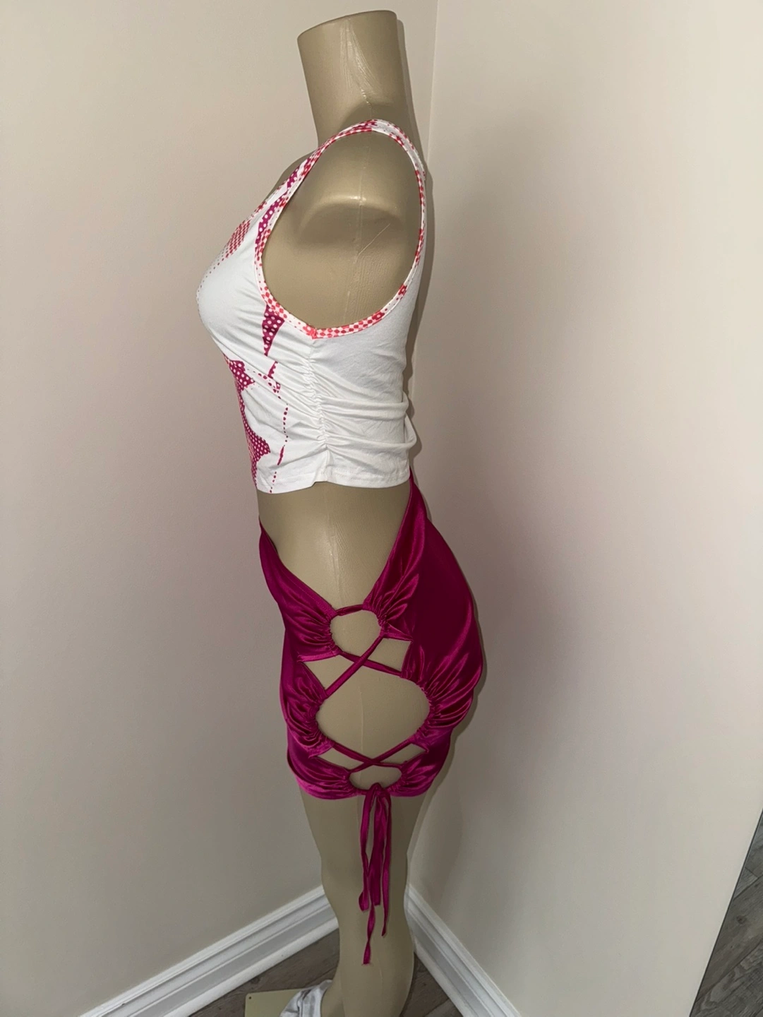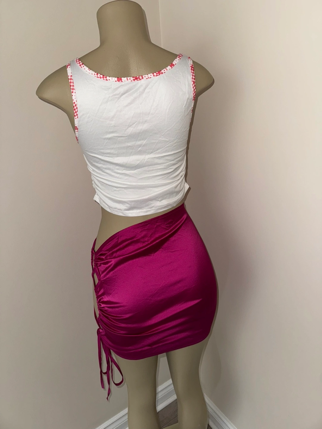 Stylish two-piece outfit. Features a white crop top with a unique pattern and a magenta mini skirt with side cutouts and drawstring detail. Perfect for a night out or casual wear.