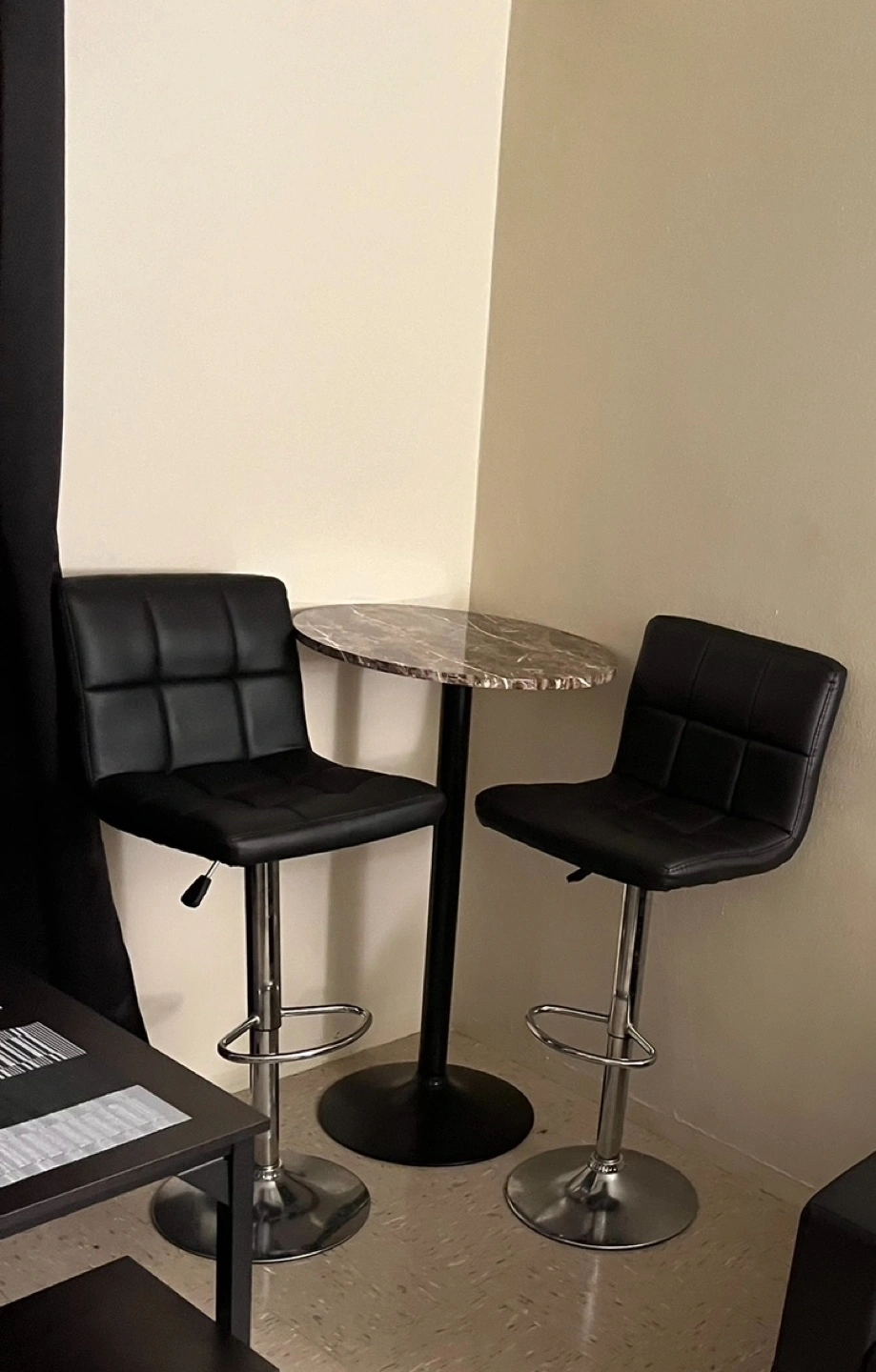 Set includes two black cushioned bar stools and a round marble table. Chrome legs and adjustable height. Great for small spaces.