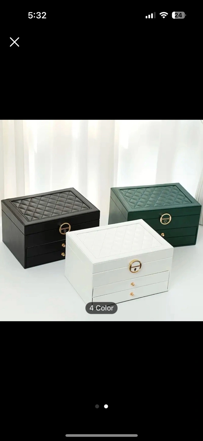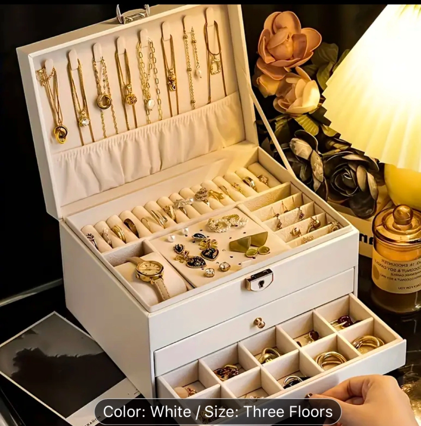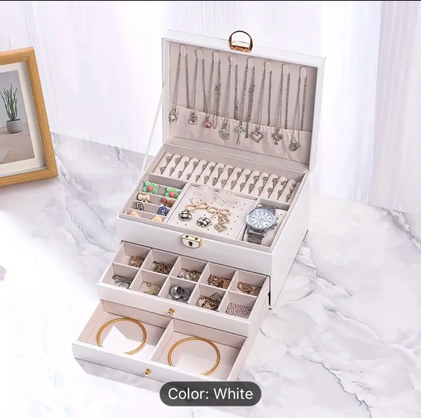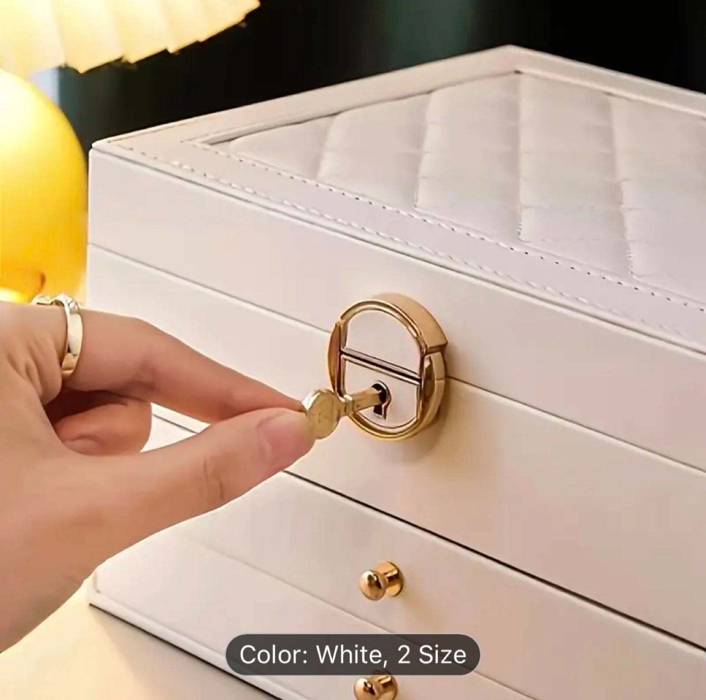Three layers for storage. Multiple compartments for rings, earrings, necklaces, and watches. Gold-toned hardware. Lockable.