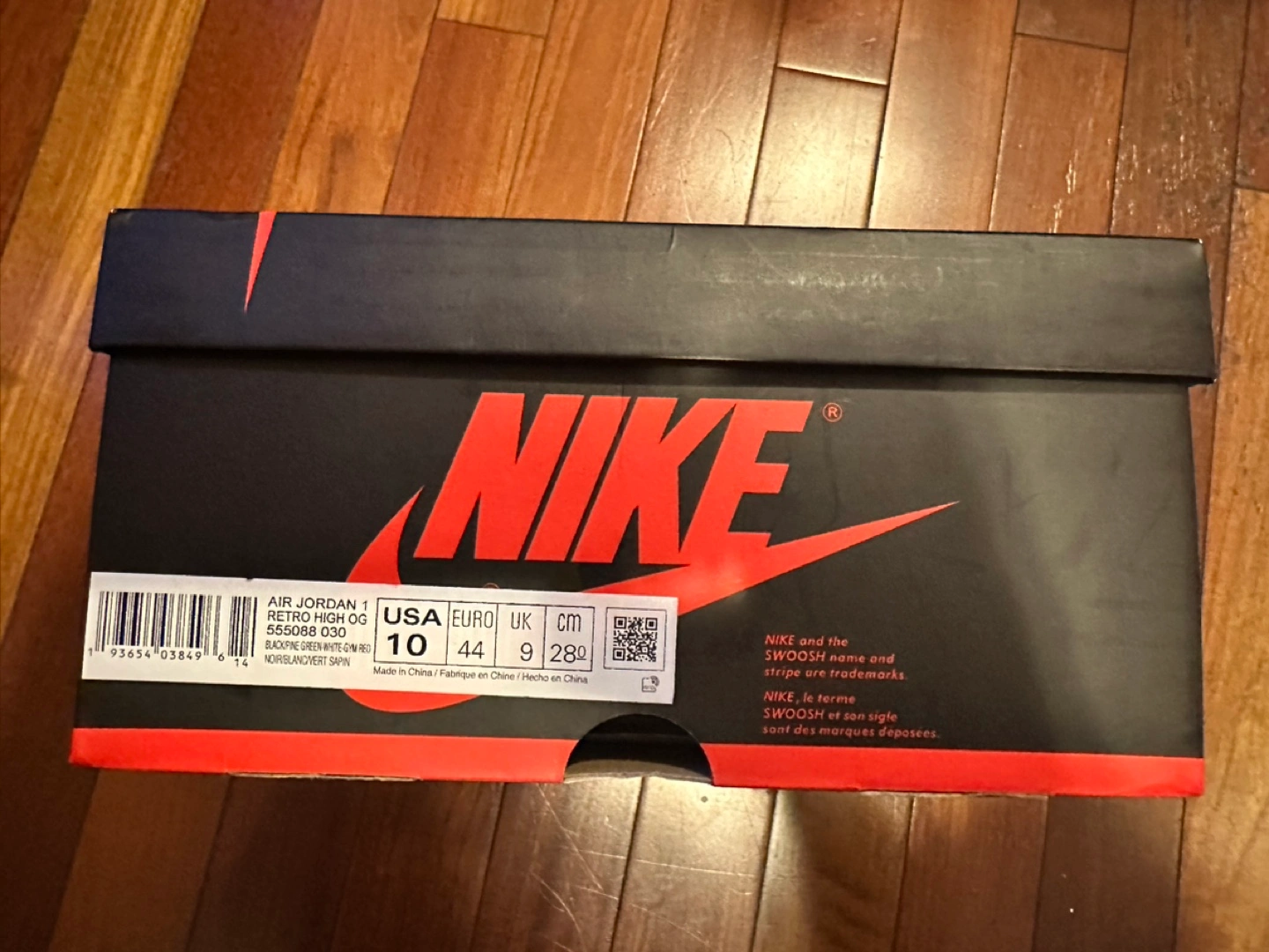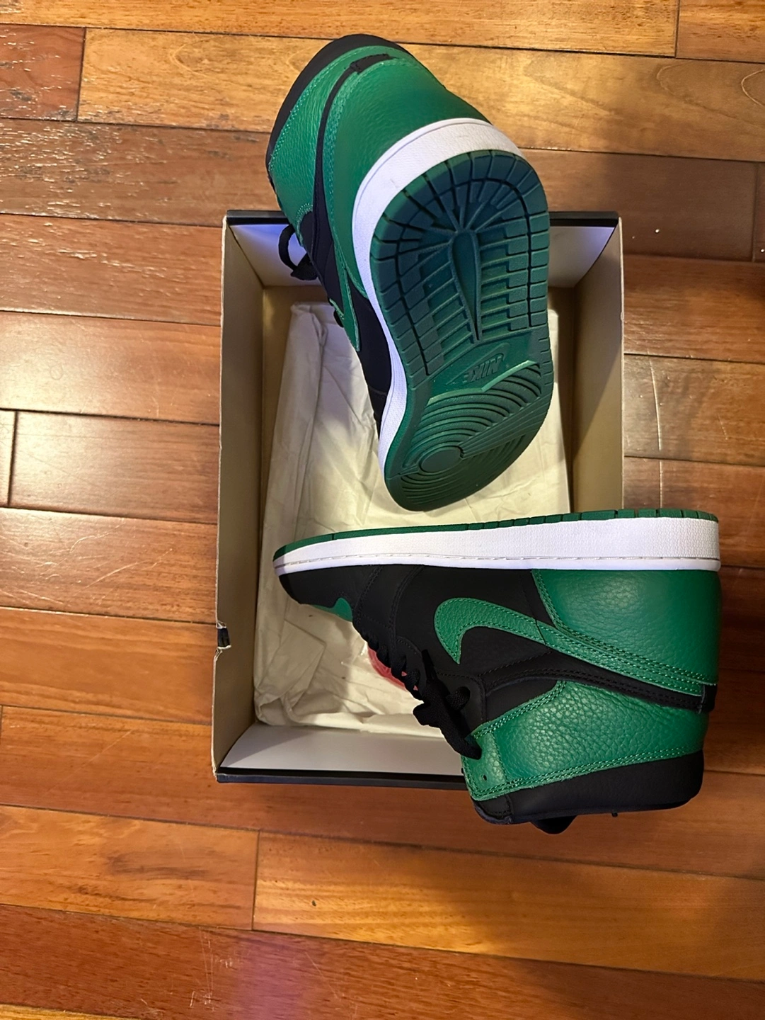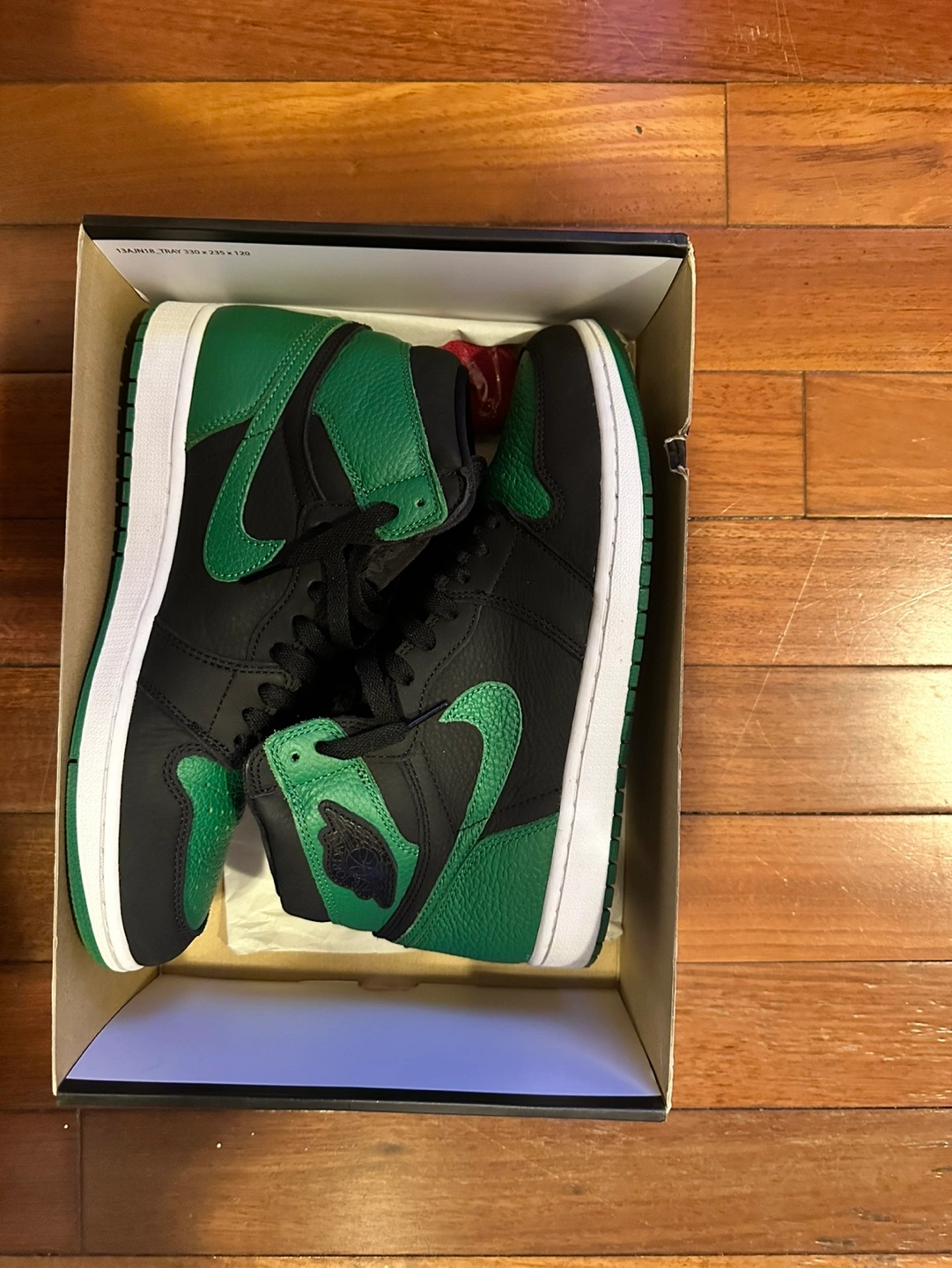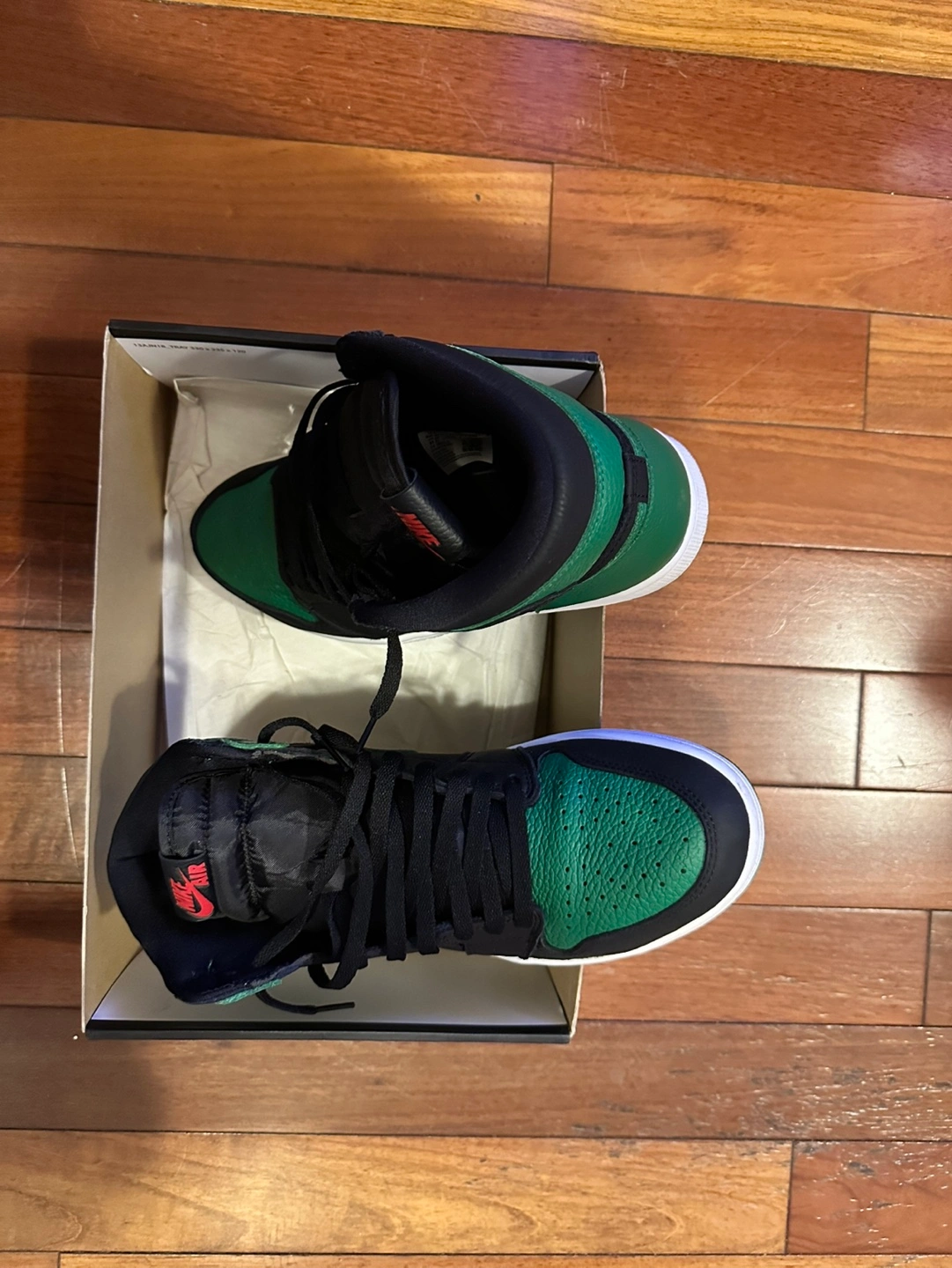 Size 10 Men's Air Jordan 1 High OG sneakers. Black and Pine Green colorway. Like New in box.