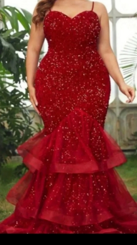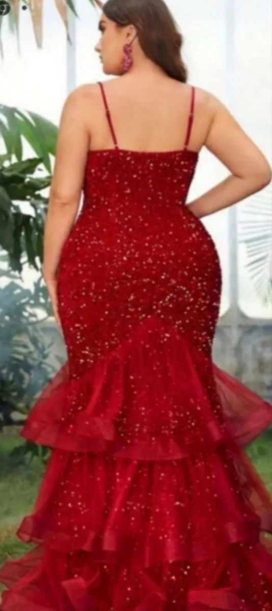 Gorgeous red sequin mermaid gown. Features a sweetheart neckline, spaghetti straps, and a tiered ruffled skirt. Plus size.