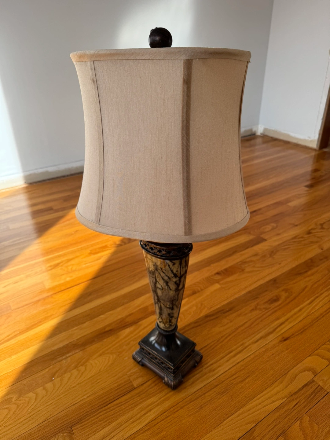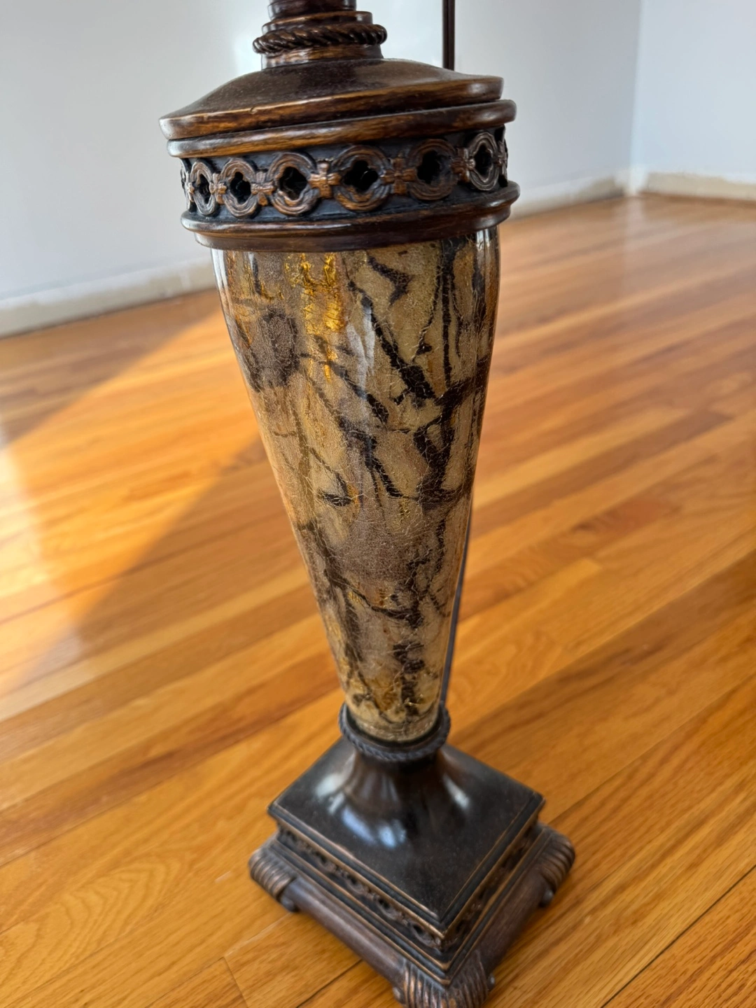Beautiful table lamp. Features a dark bronze base and a beige fabric shade. Gold and brown patterned body. Excellent addition to any room.