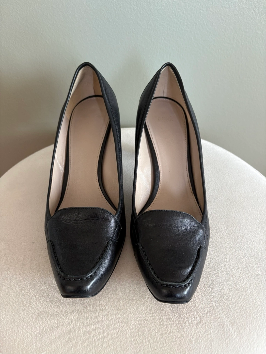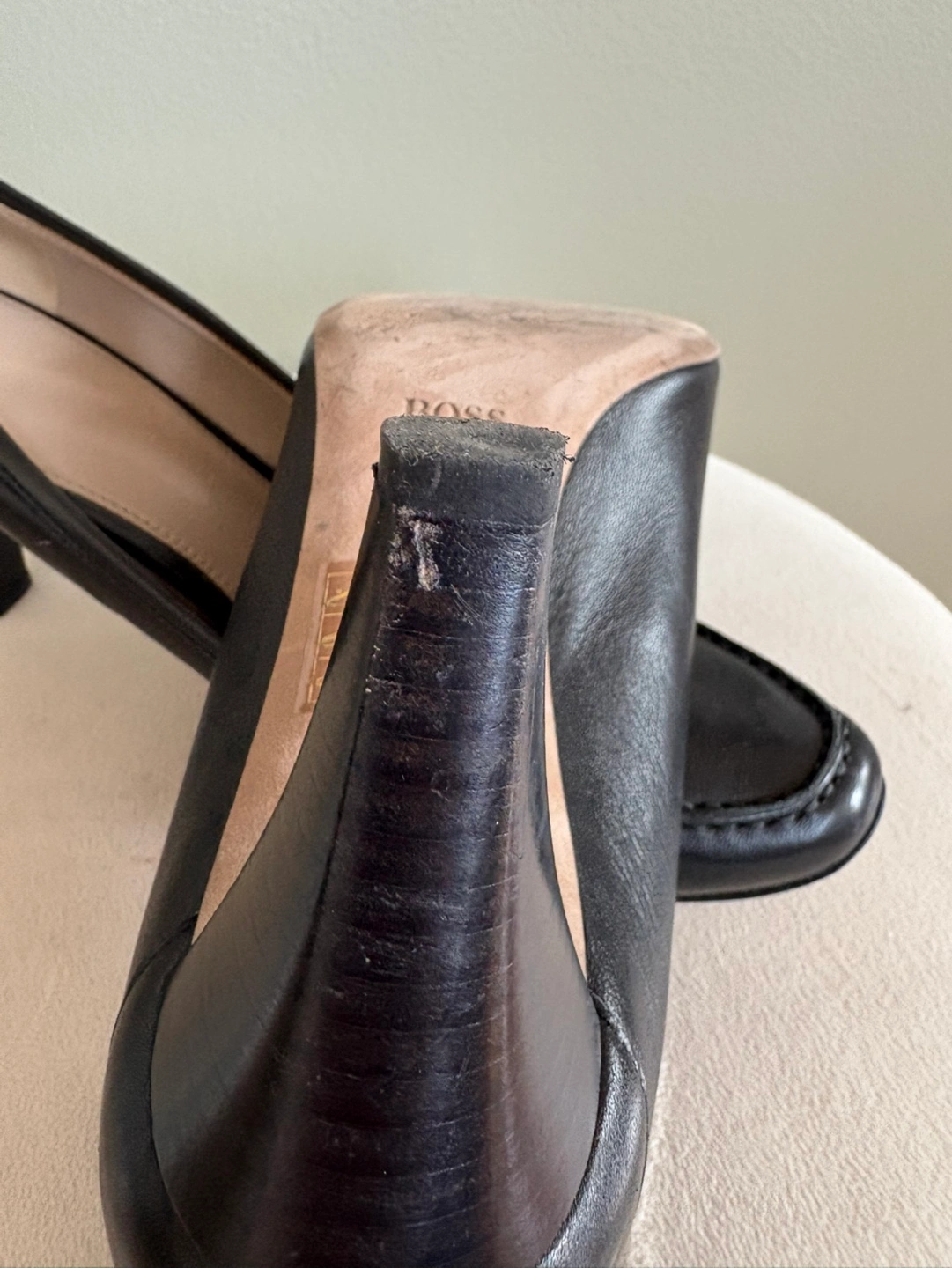 Pair of black leather BOSS heels. Size 37. Made in Italy. Slight wear as show in photos