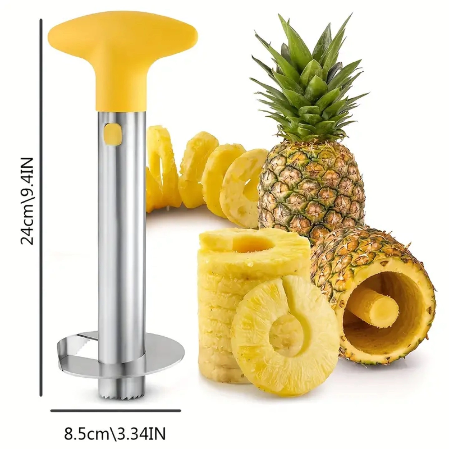 Stainless steel pineapple corer and slicer. Yellow plastic handle. Easy to use. Makes quick work of preparing pineapples.