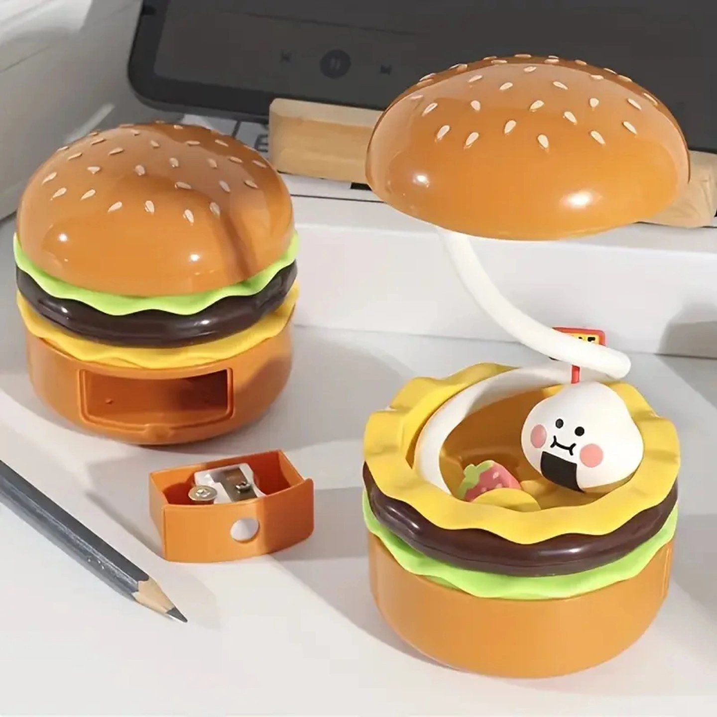 Adorable hamburger-shaped lamp/pencil sharpeners. Perfect for students or anyone who loves quirky stationery. One has a fun, spiral design. Great as a gift!