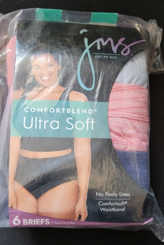 New 6-pack of Just My Size women's plus size briefs. Size 13 (30/32). Ultra soft Comfortblend fabric. No panty lines. Comfortsoft waistband. Assorted colours.