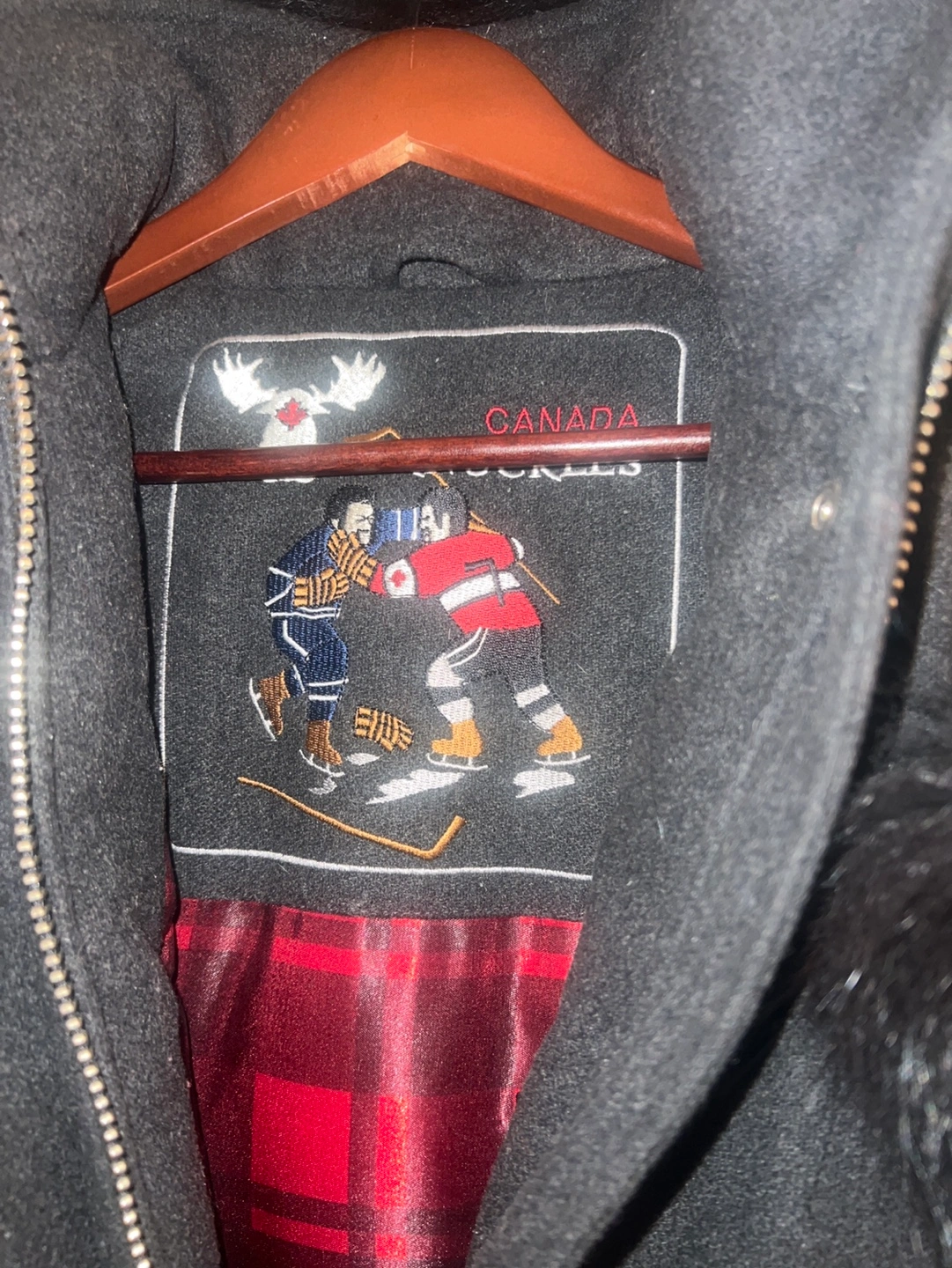 Women's black wool coat. Features a fur-trimmed hood, snap and zipper closure. Red and black plaid lining. Metal logo patch on sleeve. Excellent condition. The warmest and the most beautiful coat you can ever come across. Flawless!
