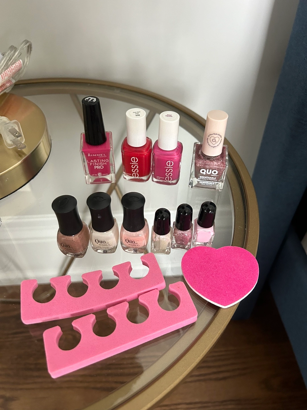Assortment of nail polishes, includes Rimmel, Essie, and Quo brands. Several shades and finishes. Also, two pink toe separators. Nail polishes are used.