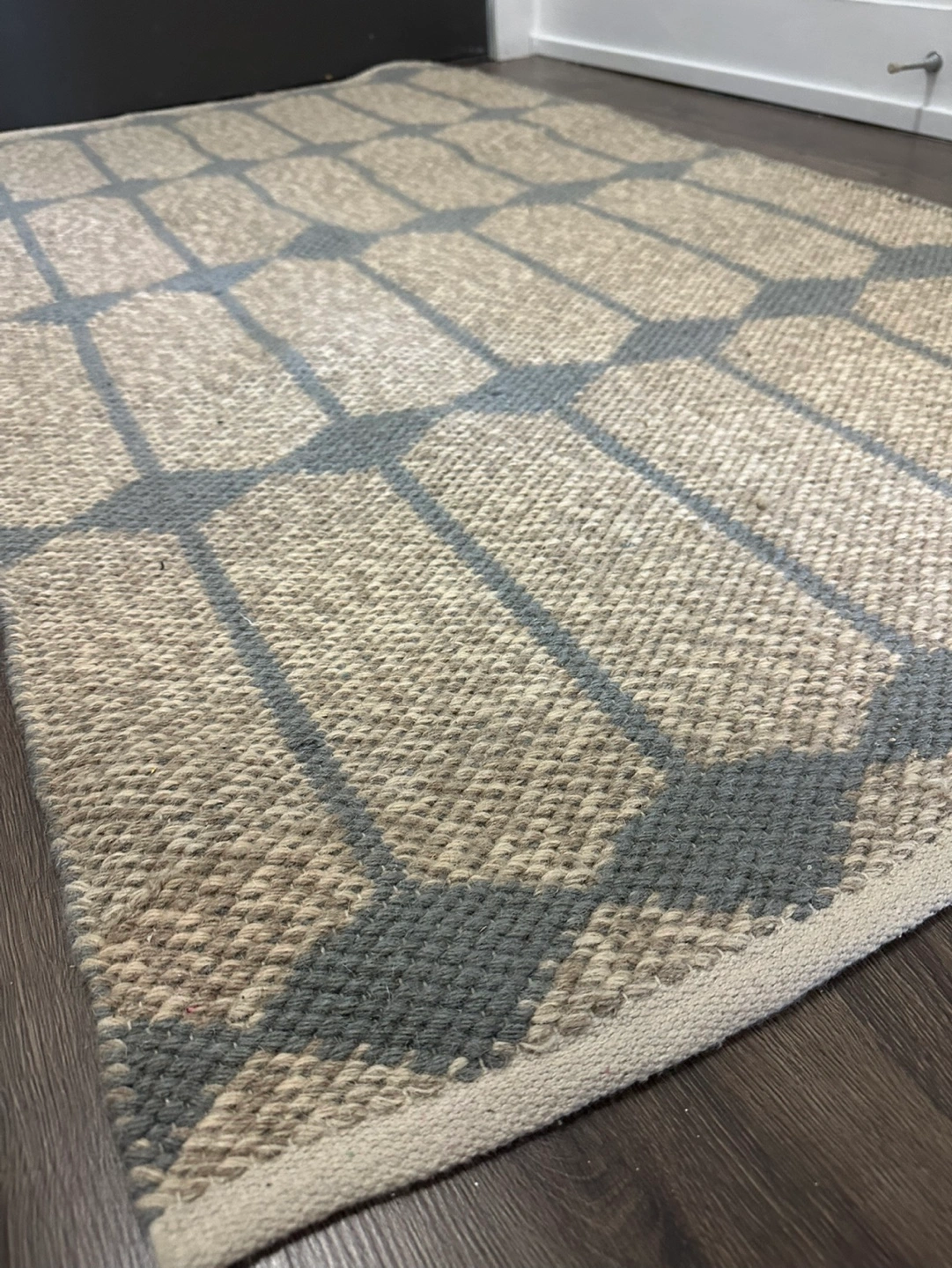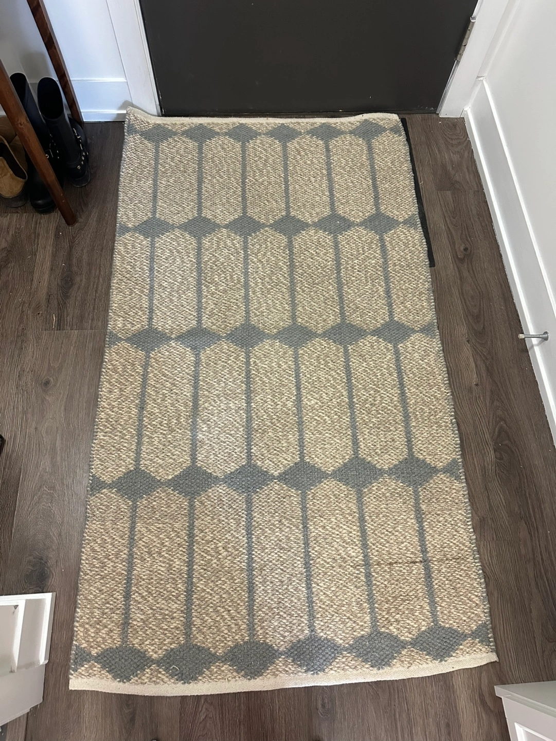 Neutral coloured rug. Grey and beige pattern. Good for entryway or small space.