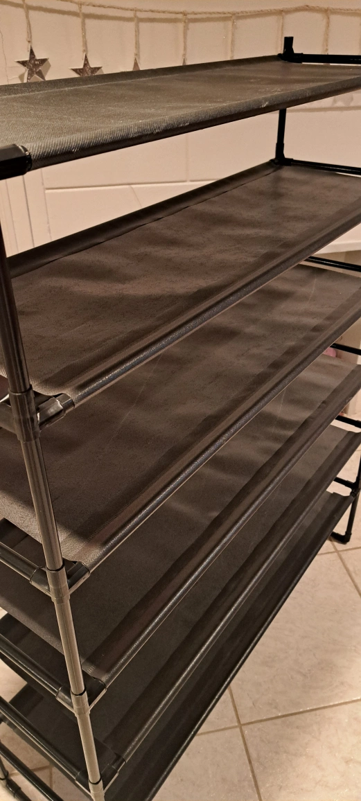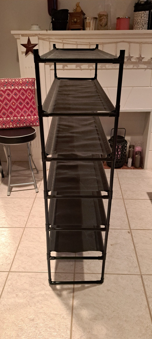 Space-saving shoe organizer. Five shelves. Black metal frame and fabric shelves. Easy assembly. Good for entryways or closets .6 shelved shoe rack. Used only for 2 months.