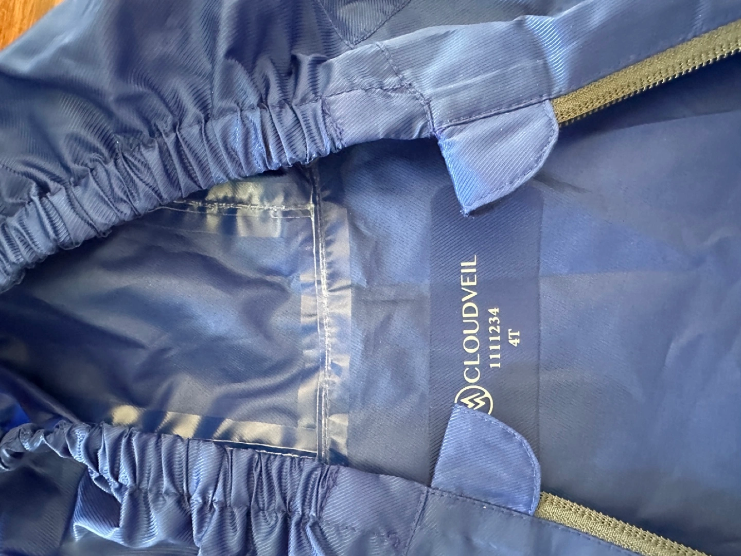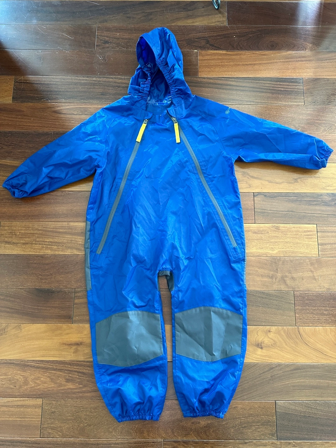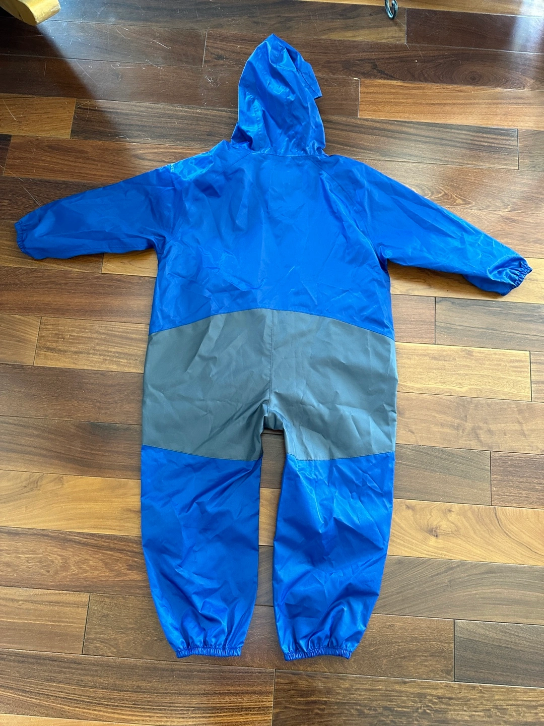 Waterproof rainsuit. Blue with grey accents. Zipper closure. Hood. Great for puddle jumping. Size 4T.