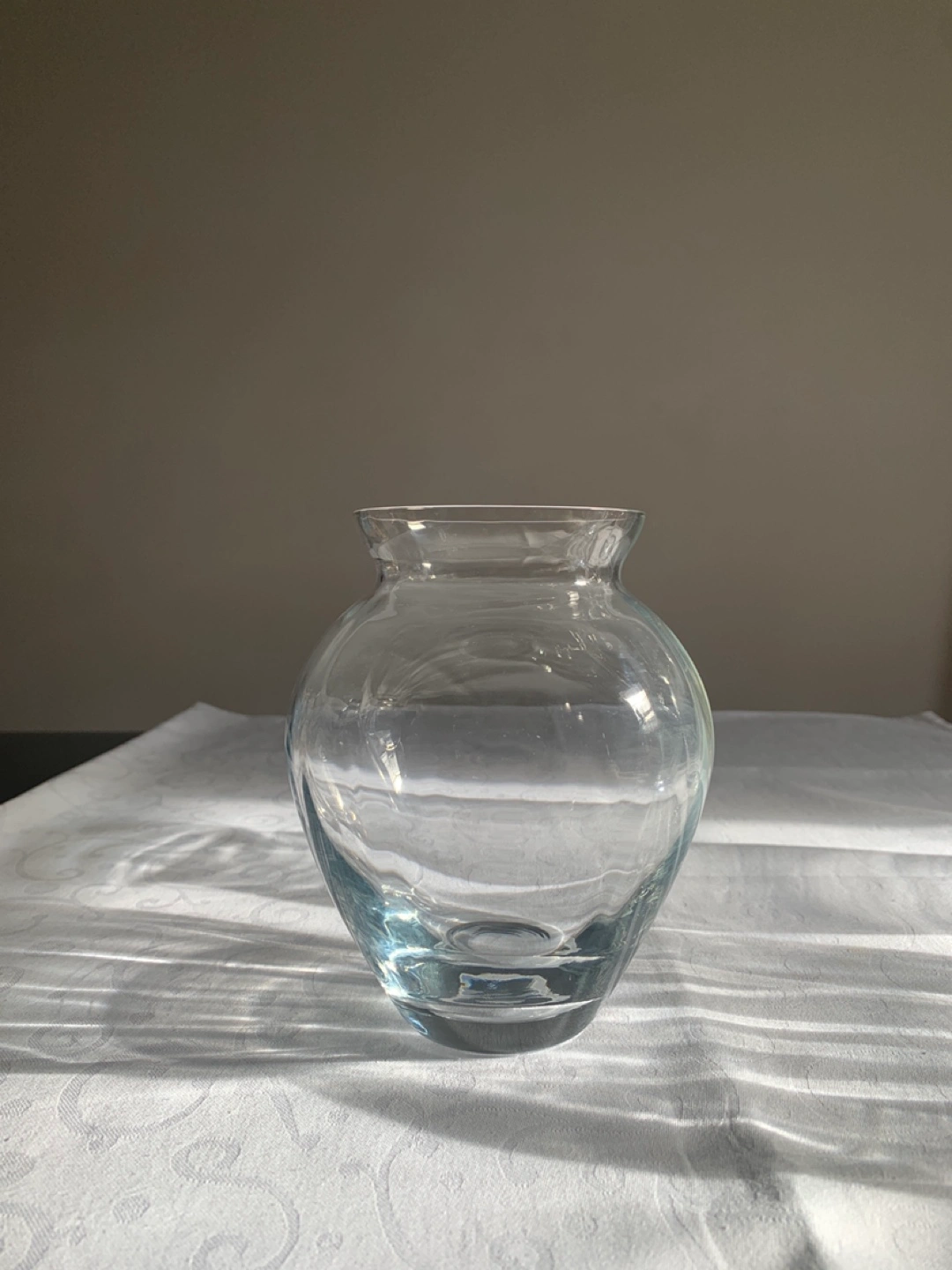 Small, clear glass vase. Round shape, simple design. Perfect for small bouquets or decorative accents.