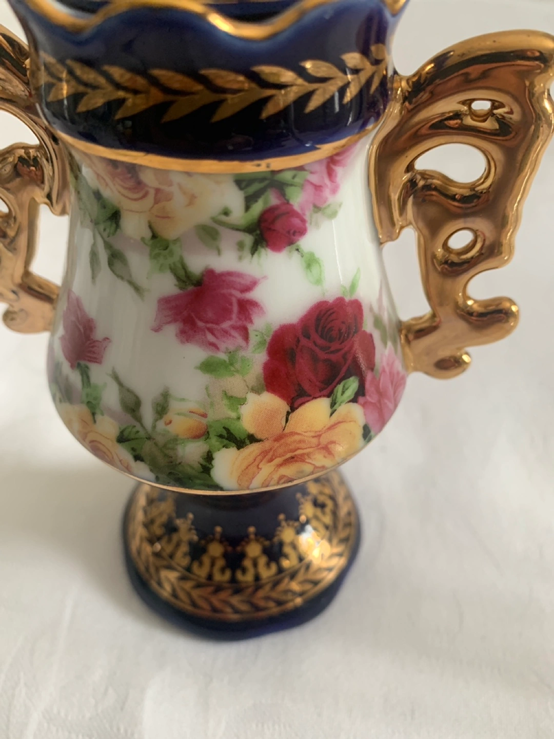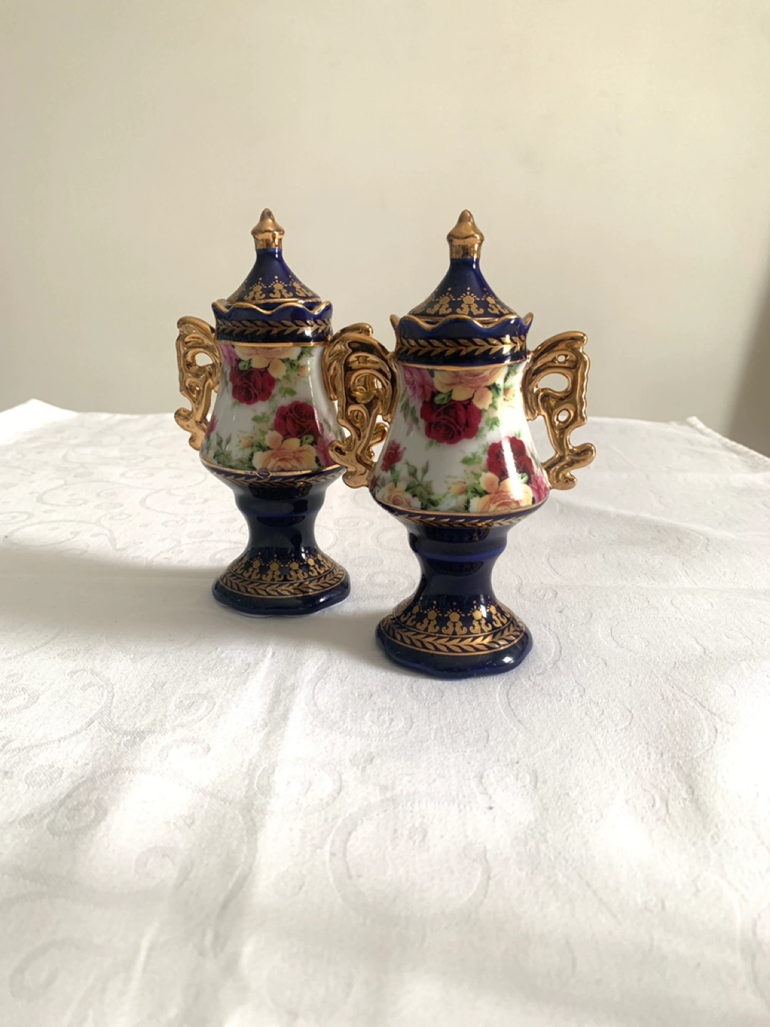 Ornate porcelain mini vases. Dark blue and gold detailing. Floral pattern featuring delicate roses. Lidded. Gold handles. Small size, ideal for display and holding precious items.