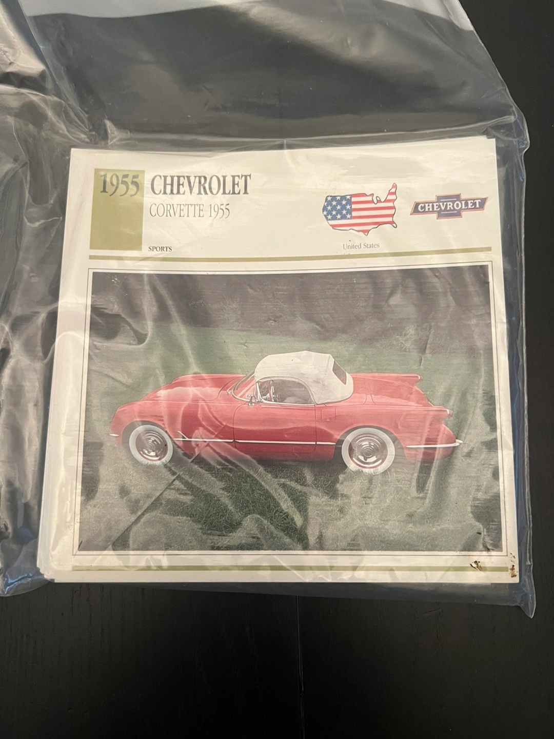 Set of collectible cards featuring various classic car models. Includes makes like Chevrolet, Porsche, Jaguar, and others. Great for collectors or enthusiasts. Cards show some minor wear.
