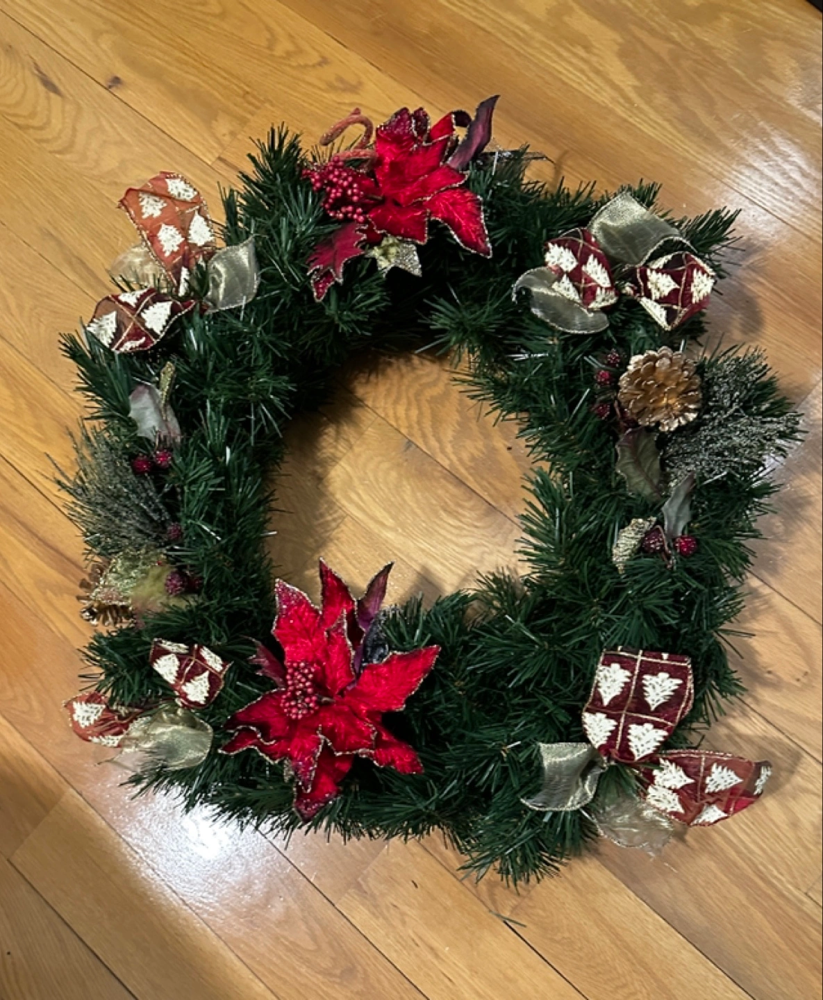 Beautiful Christmas wreath. Features lush green boughs, red poinsettias, pine cones, and decorative ribbons. Perfect for your holiday décor.