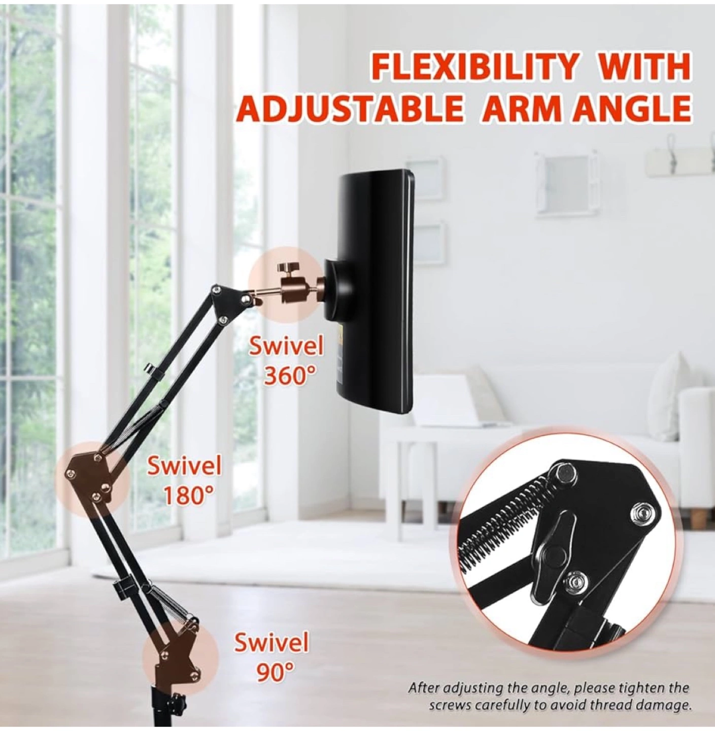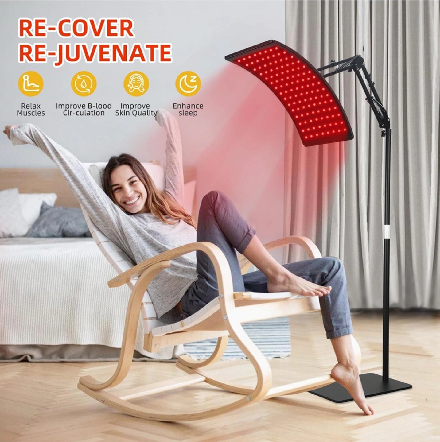 Red light therapy lamp with adjustable stand. Great for home use. Improves circulation and skin quality. Relax muscles and enhance sleep. Use in living room, bedroom, office, or beauty salon.