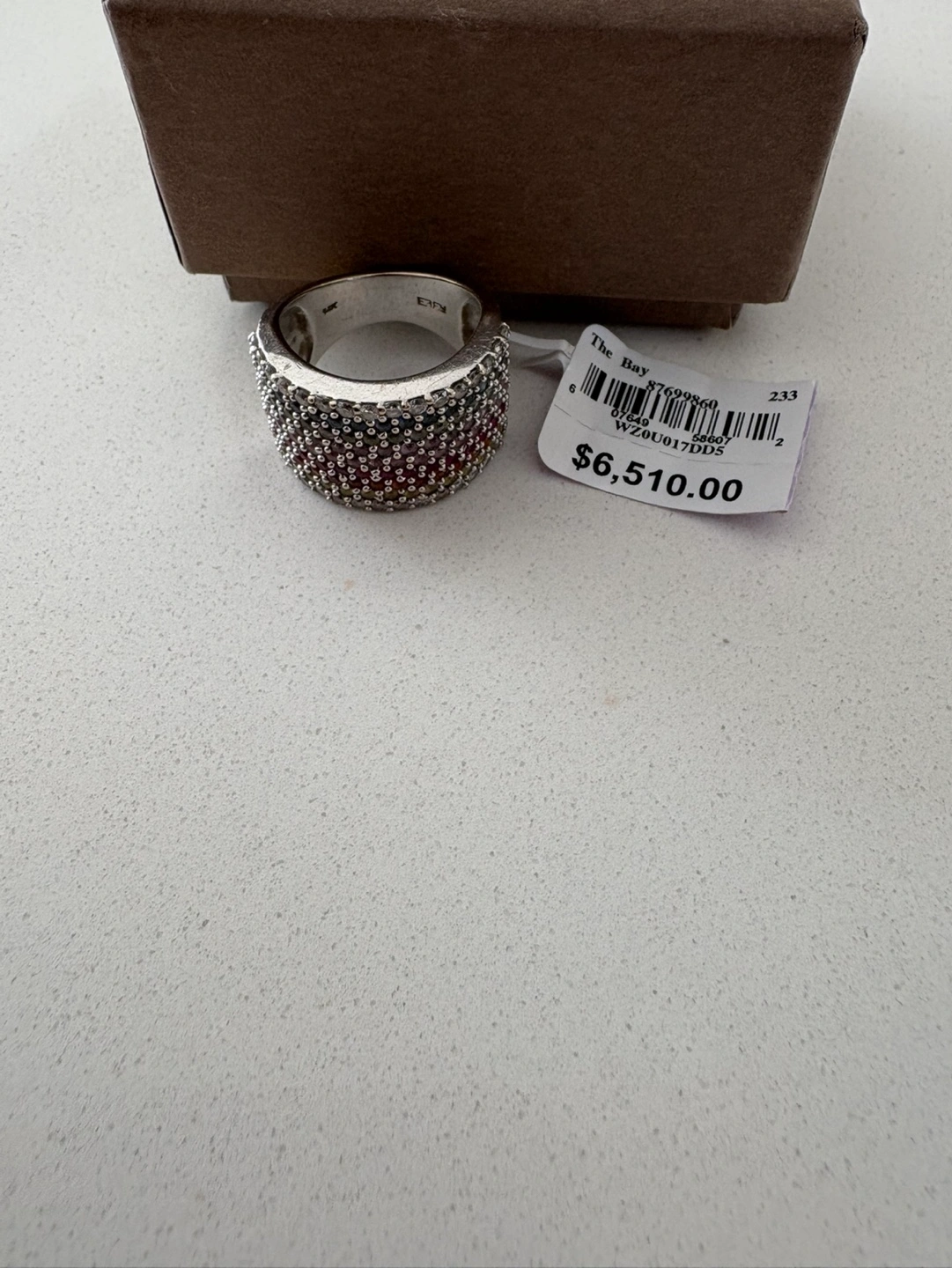 Stunning wide band ring. Features rows of colourful sapphires and diamonds. Silver setting. Comes in original box.