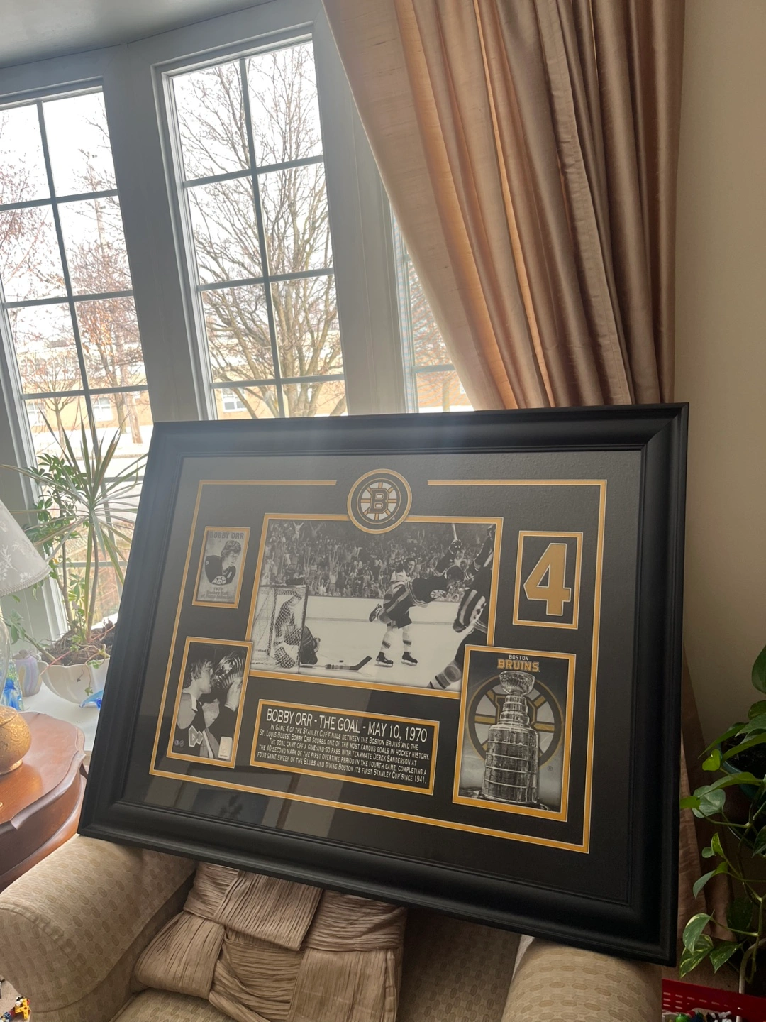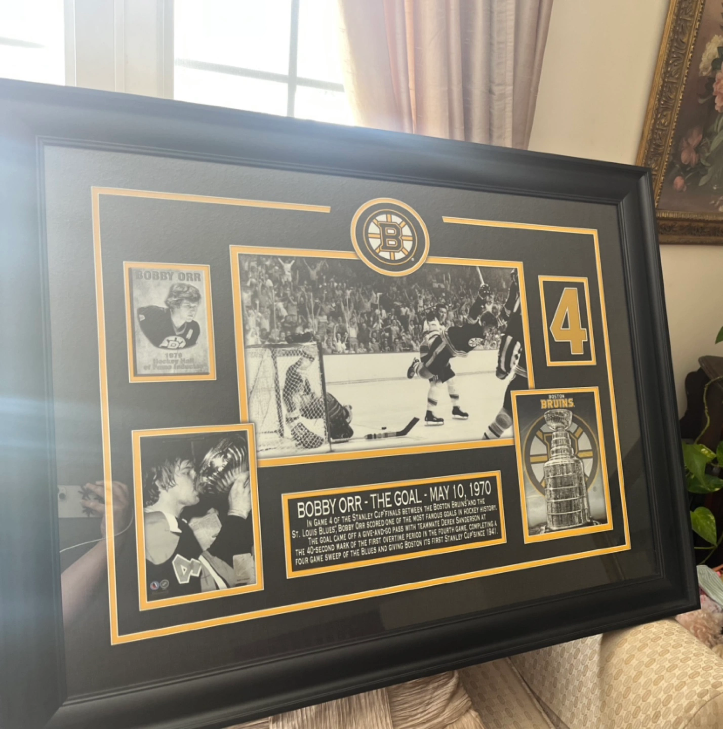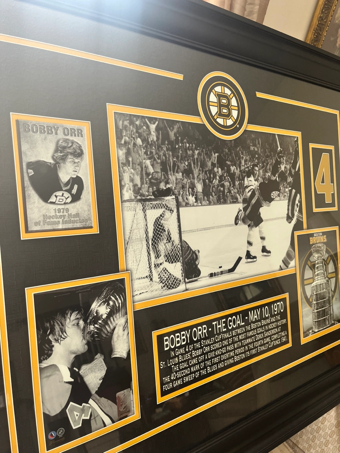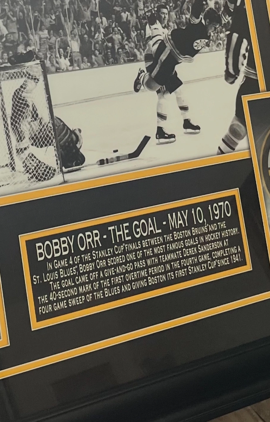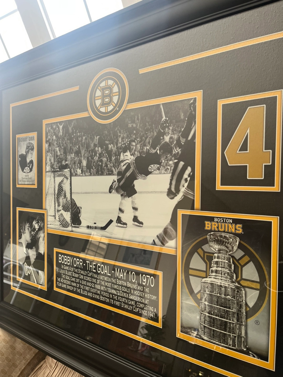 Collectible framed print featuring iconic photos of Bobby Orr’s famous goal. Includes game details and images of Orr and the Stanley Cup. Large format, black frame. Excellent condition. 3 feet across x 28.5” down. Originally purchased at an auction for $300. Available for pickup in Markland Wood.