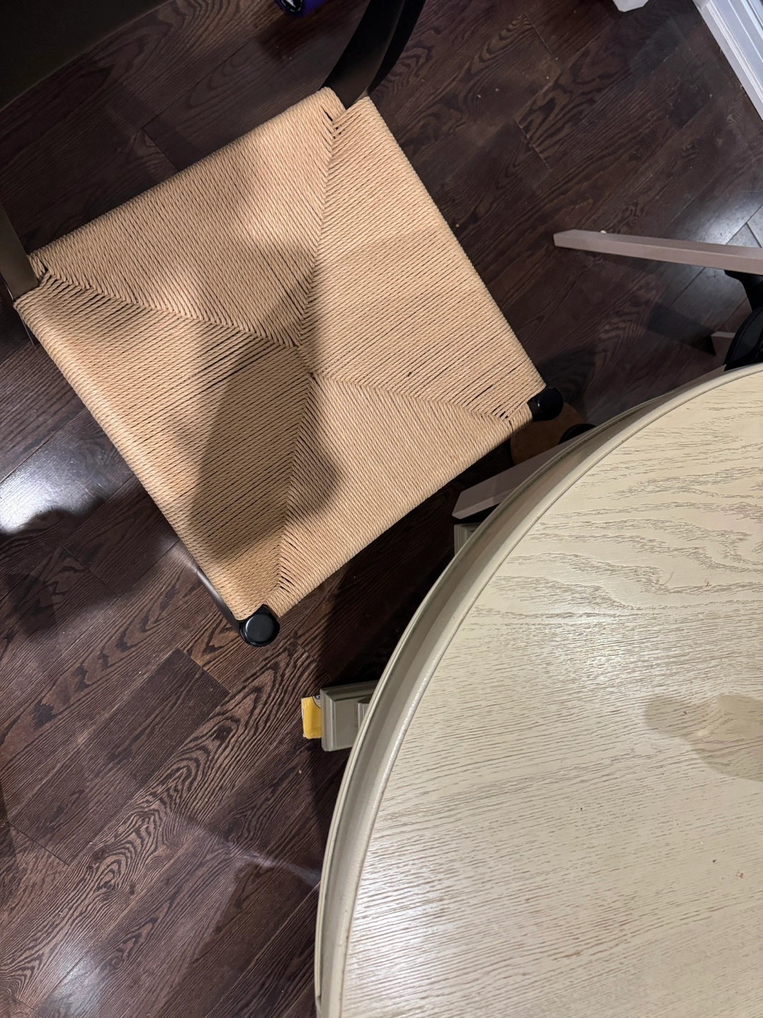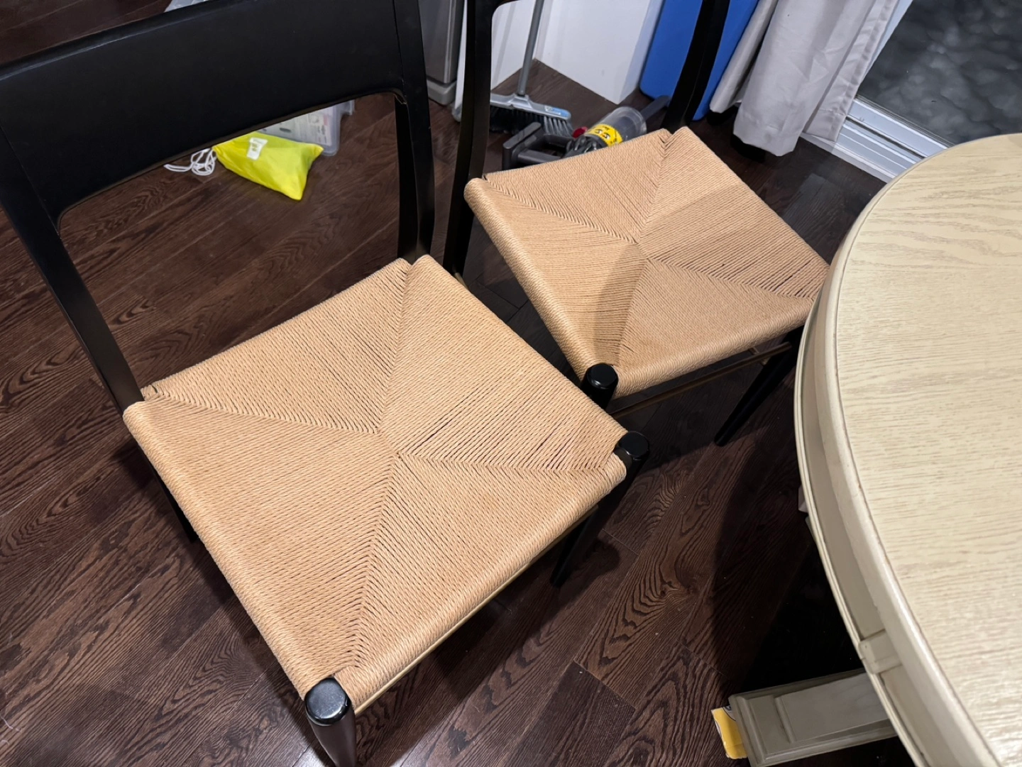 Four dining chairs. Black legs and a woven tan seat. Minimalist design. Good condition.