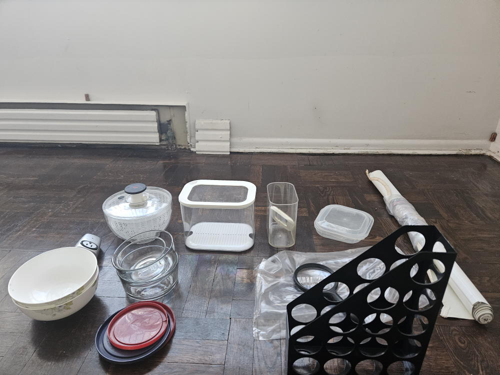 Assorted kitchen items. Includes a salad spinner, glass storage containers, plastic food containers, a magazine file, and two bowls. Some items appear new, others show some wear.
