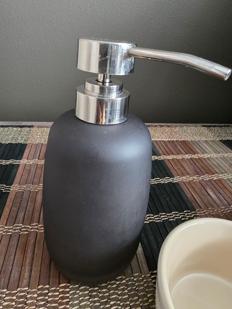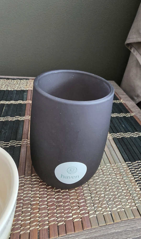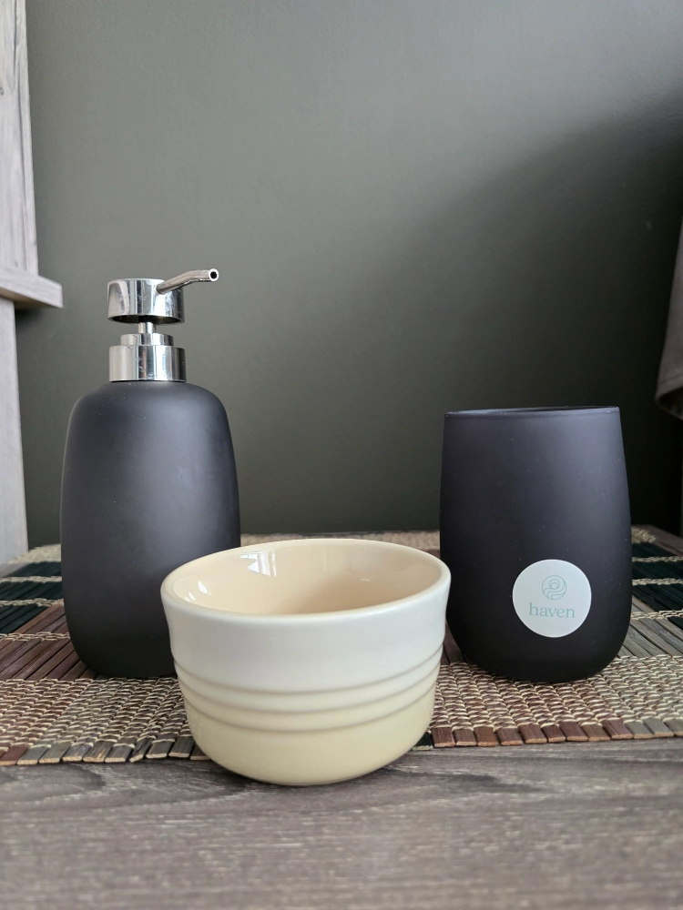 Haven bathroom set: soap dispenser, tumbler, and small bowl.