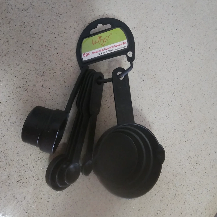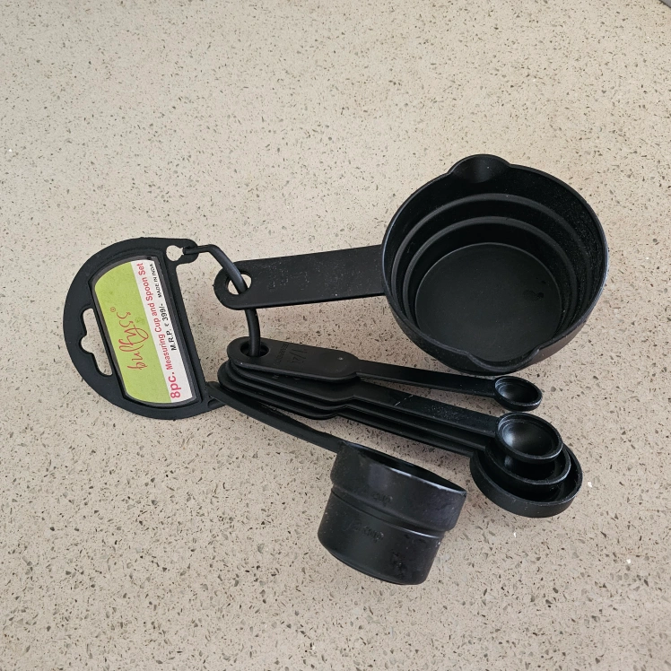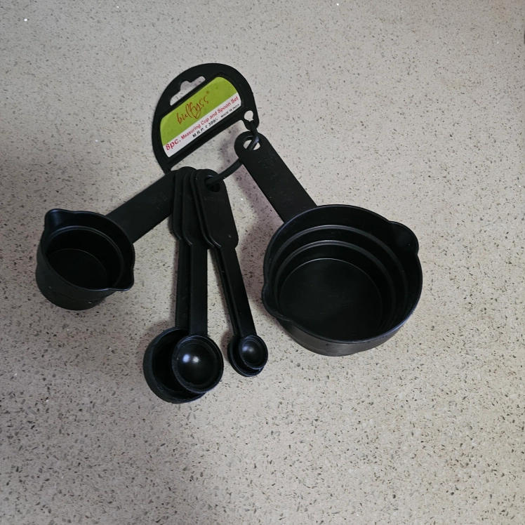 New, black plastic measuring cups and spoons. Eight pieces total. Convenient for baking and cooking. Great for everyday use.