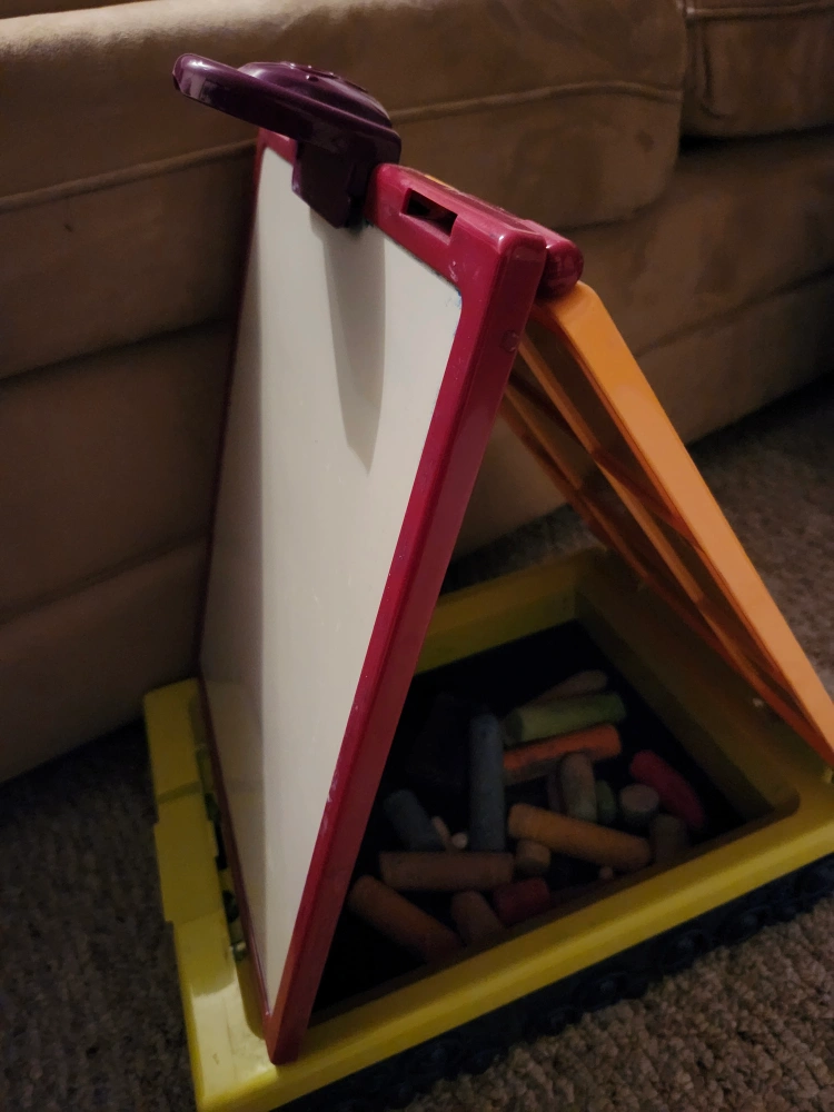 22Portable easel , double-sided. One side chalkboard, other whiteboard. Includes chalk. Great for kids.