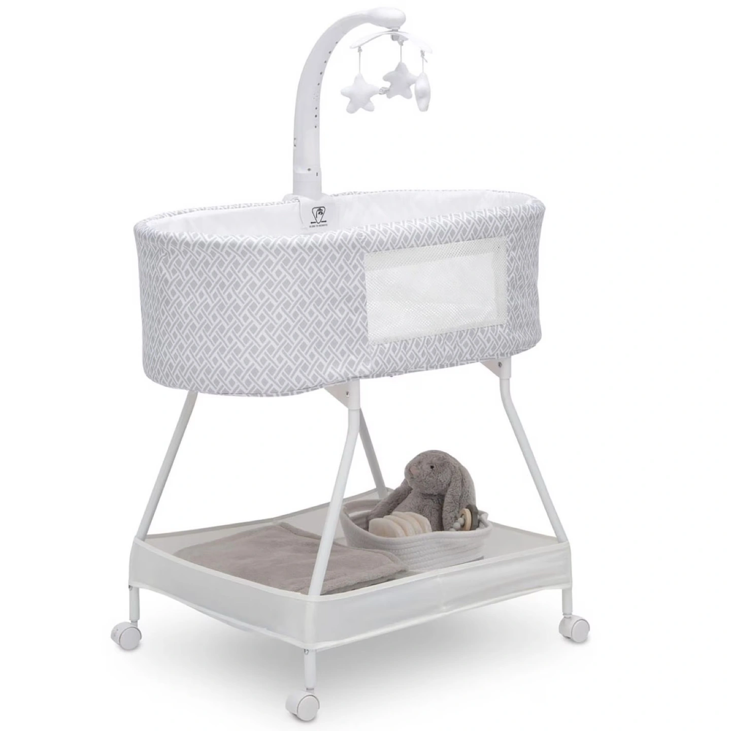 Delta children portable baby bassinet. Features a stand with storage shelf. In good condition, selling because my baby outgrew it