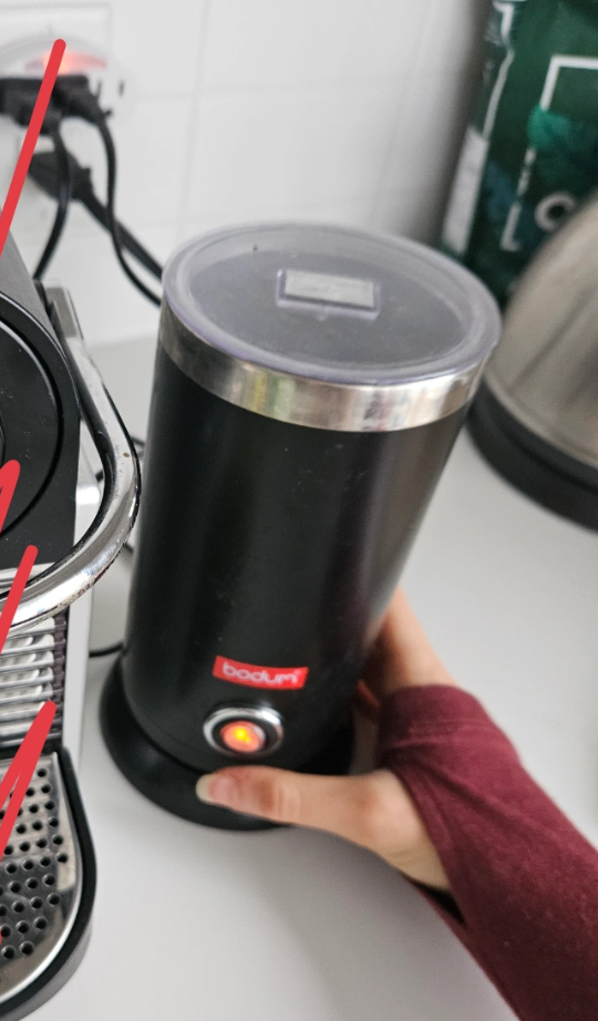 Milk frother by bodum! A delightful way to prepare warm lattes of all kinds—coffee, matcha, turmeric, beetroot, hojicha. No whisk required. Works well!