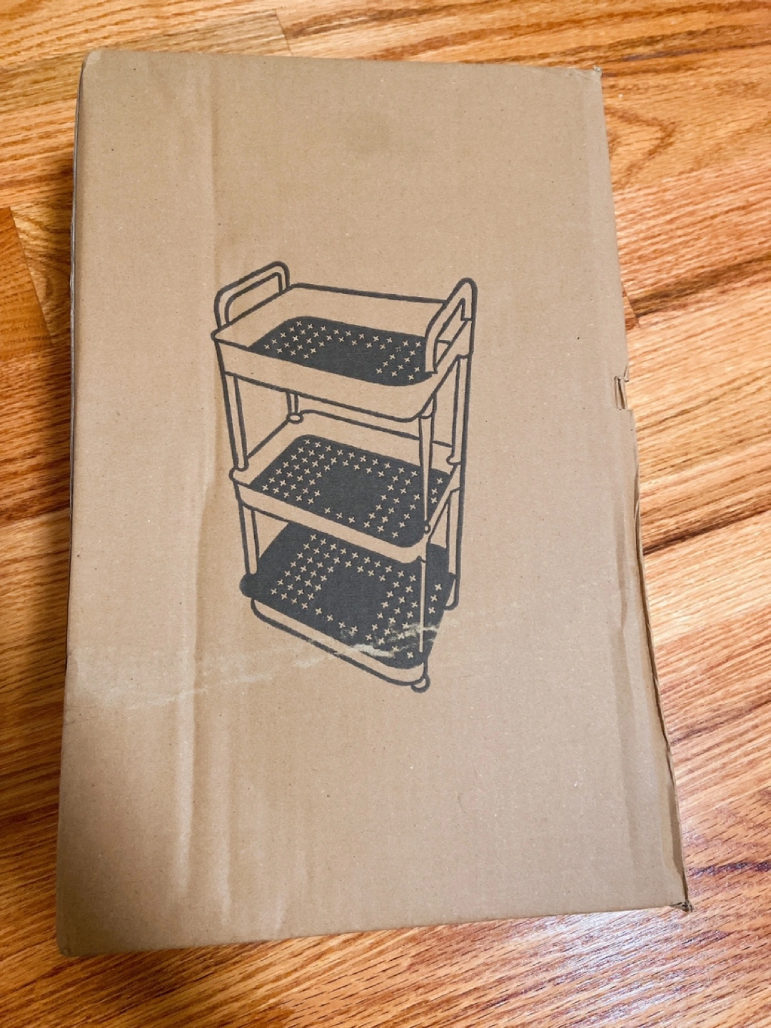 Brand new, unassembled three-tier rolling cart. Beige plastic shelves and white metal frame. Includes all parts and instructions. Perfect for storage and organization.