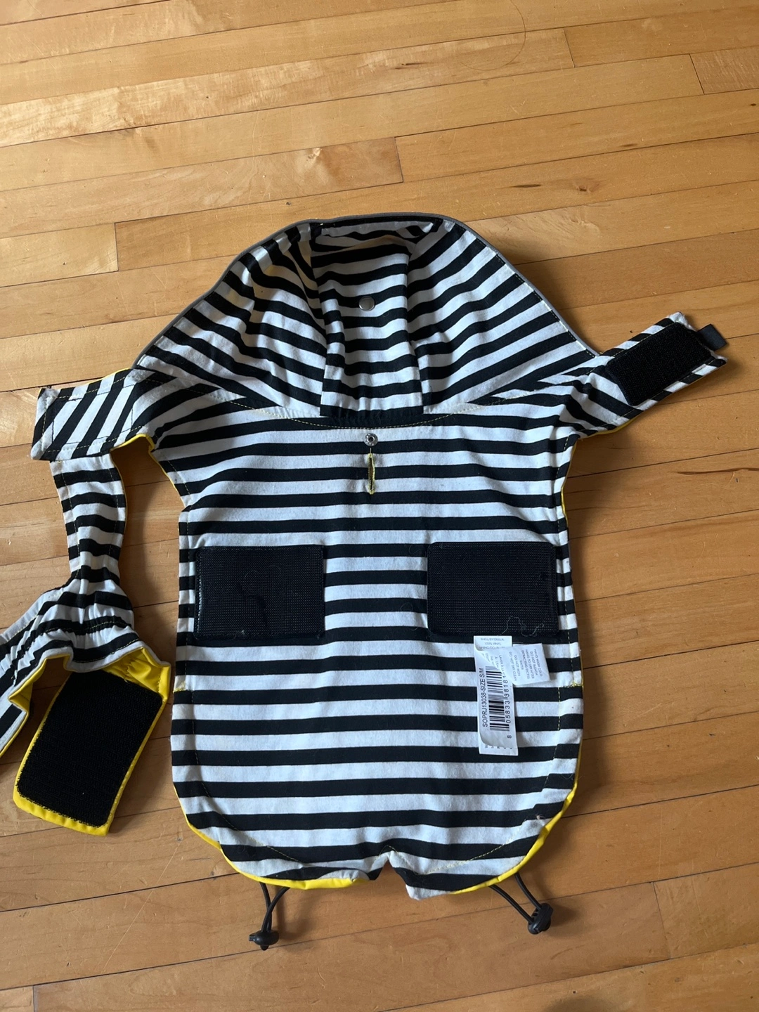 1 adorable dog raincoats. Inside cloth black & white striped, outside waterproof yellow. Both feature hoods and leg openings. Great for keeping your furry friend dry on rainy days. Size small. My dog out grew it. Very good quality.