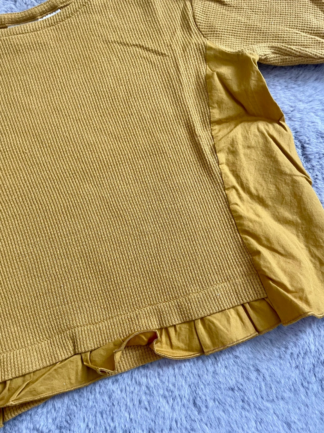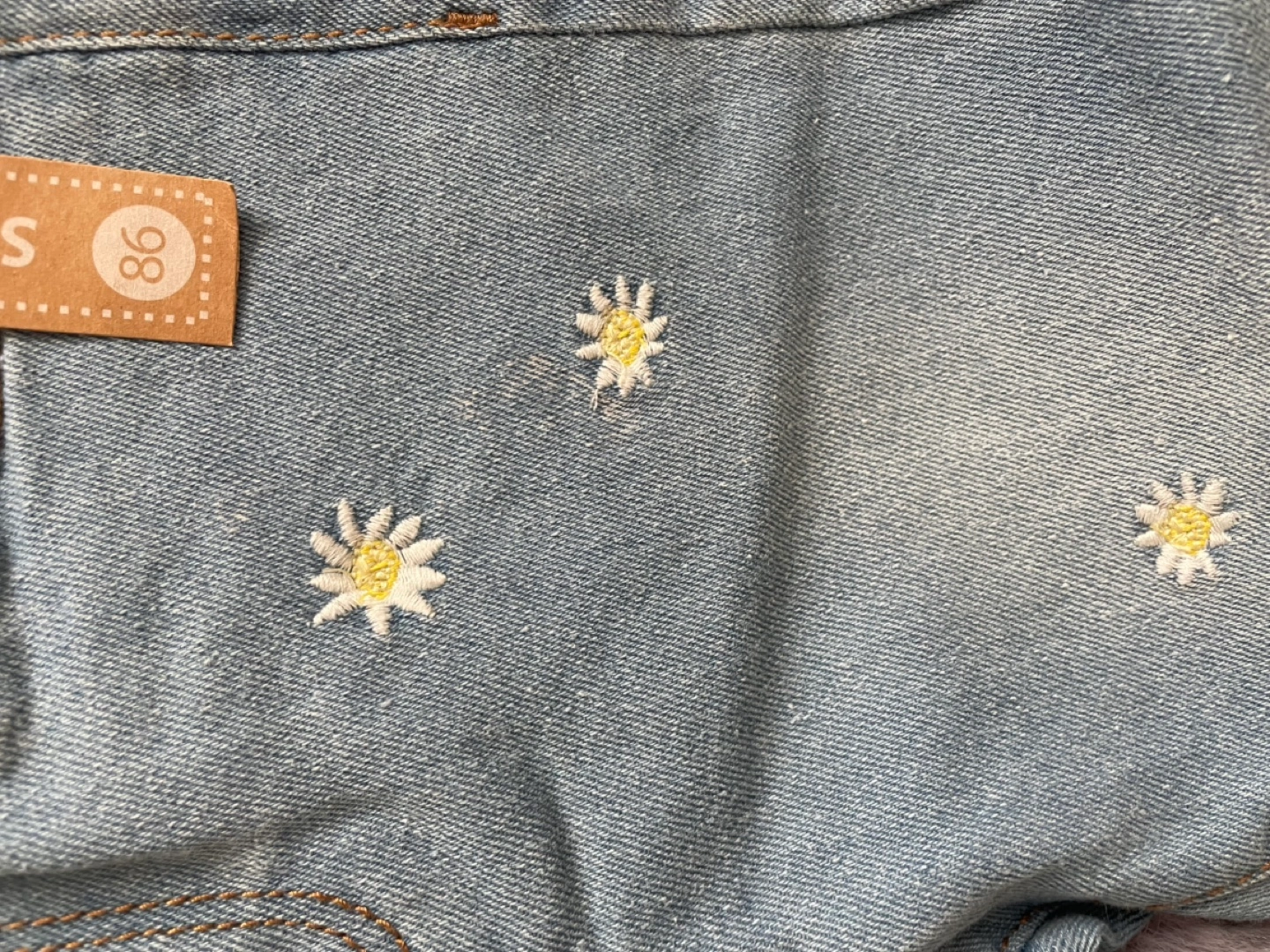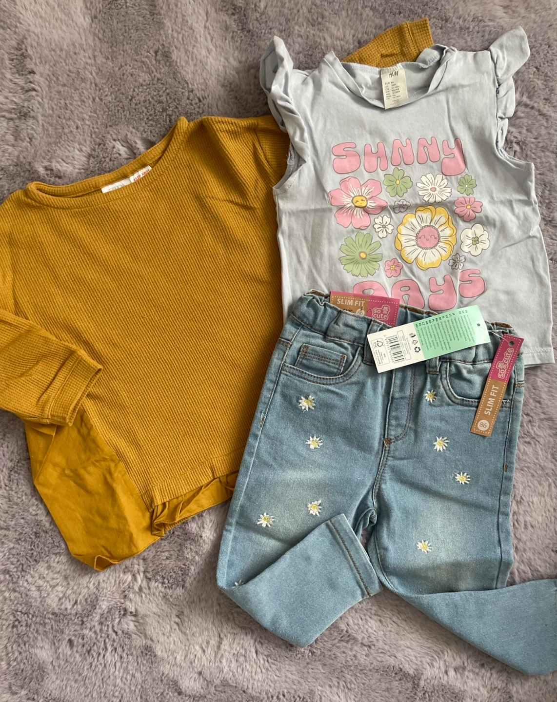 Includes a light blue H&M short-sleeve top with floral print, a mustard yellow waffle knit long-sleeve Zara top with a ruffle detail, and light wash denim jeans with embroidered daisies. Perfect for spring or summer.