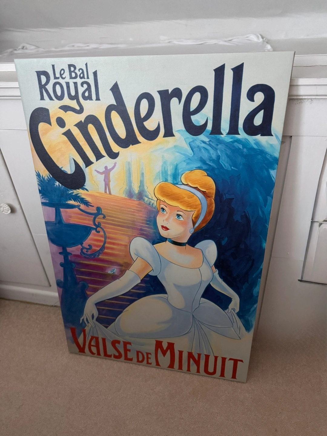 Vintage-style Cinderella canvas print. Features Cinderella in her ballgown. French text: Le Bal Royal, Valse de Minuit. Perfect for Disney fans.