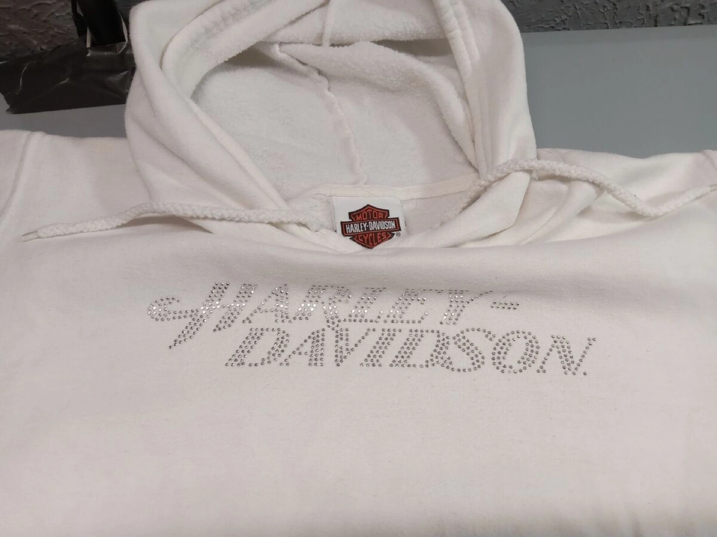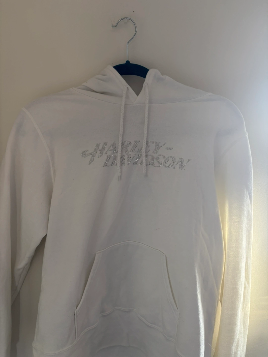 87White Harley Davidson hoodie. Features rhinestone detailing . Size Large. In excellent condition Meet up and cash only pls 🙂 Meet up is in Nobleton (king rd & hwy 27)