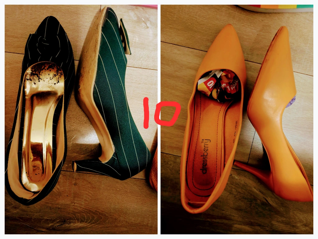 Two pairs of women's high heels. One pair dark teal with gold accents. The other pair orange. Used condition. Some wear and tear.