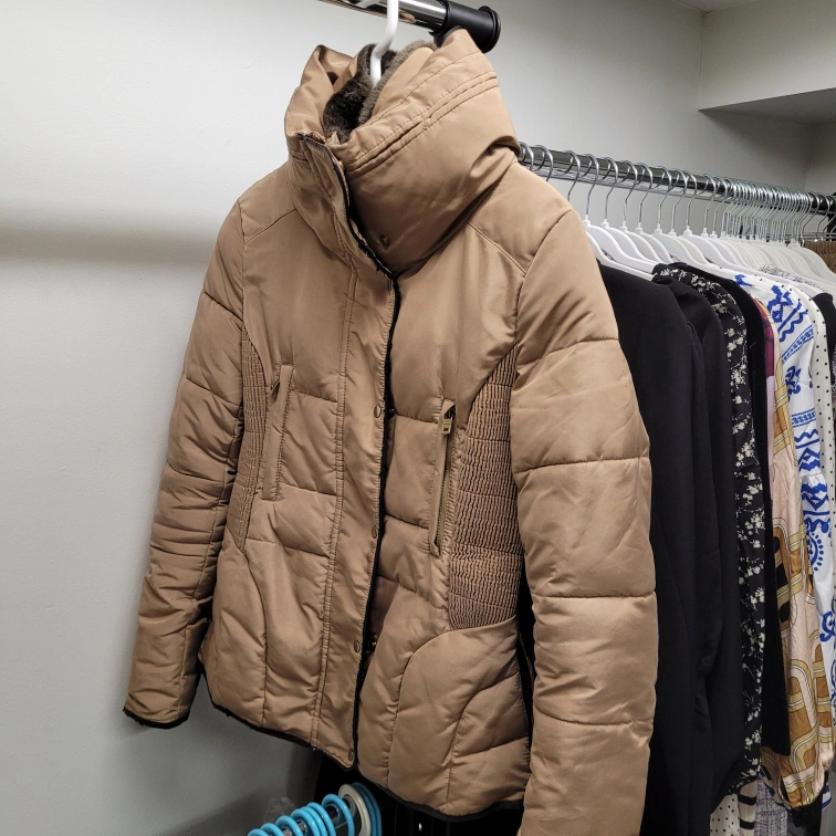 Women's golden beige puffer jacket.