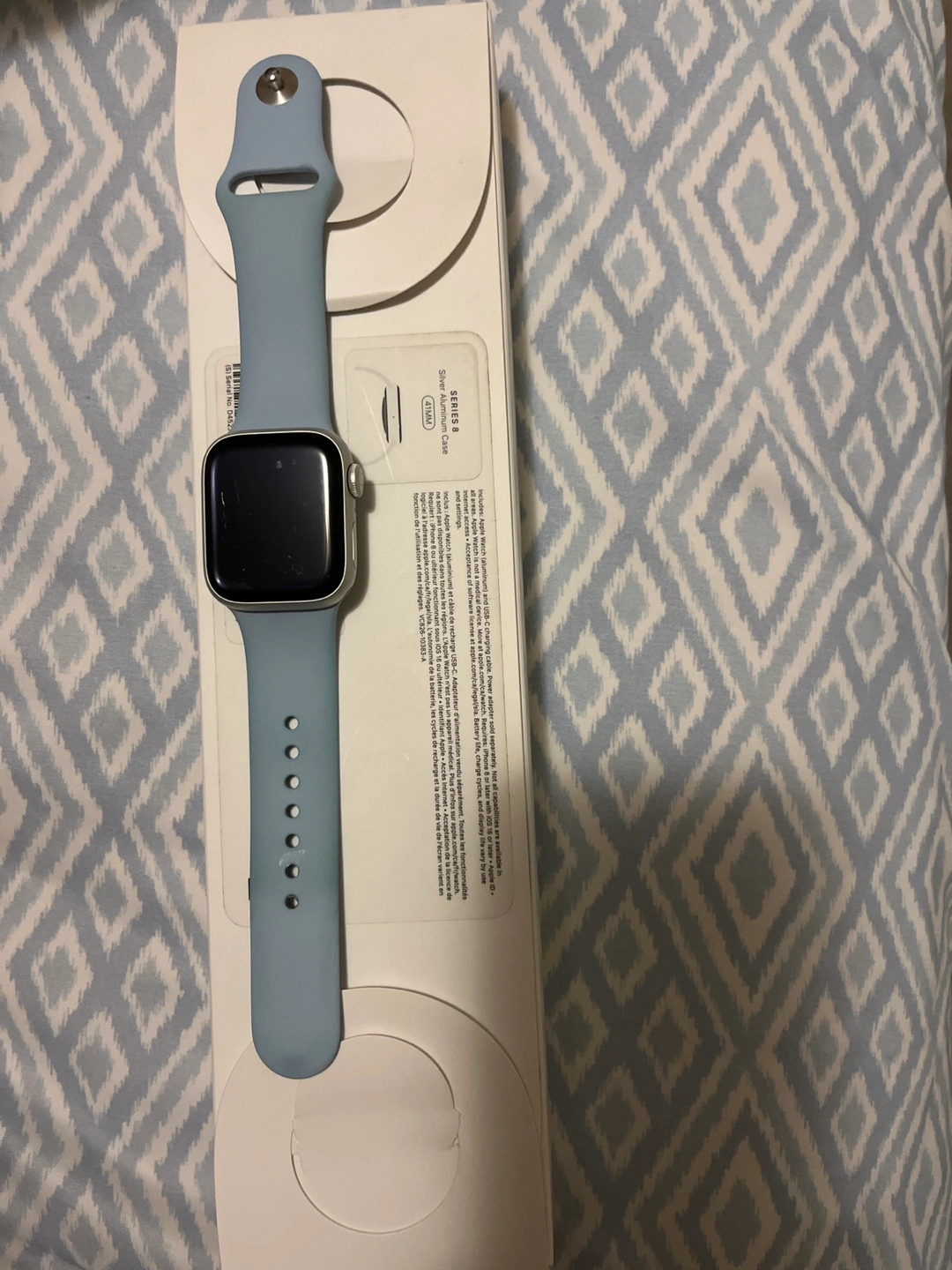 Apple Watch Series 8, 41mm silver aluminium case with light blue sport band. Used, complete with charger and blue strap Very good condition with box.