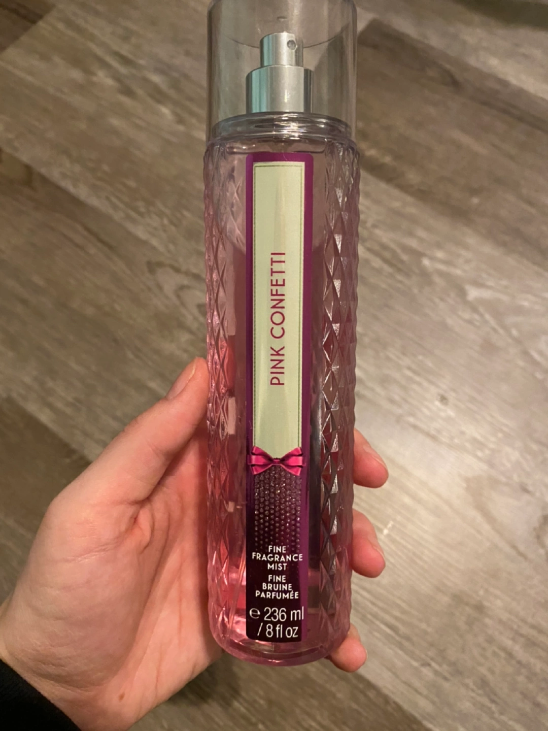 New fine fragrance mist from bath and body works in the scent pink confetti. Maybe sprayed once or twice just to smell it.