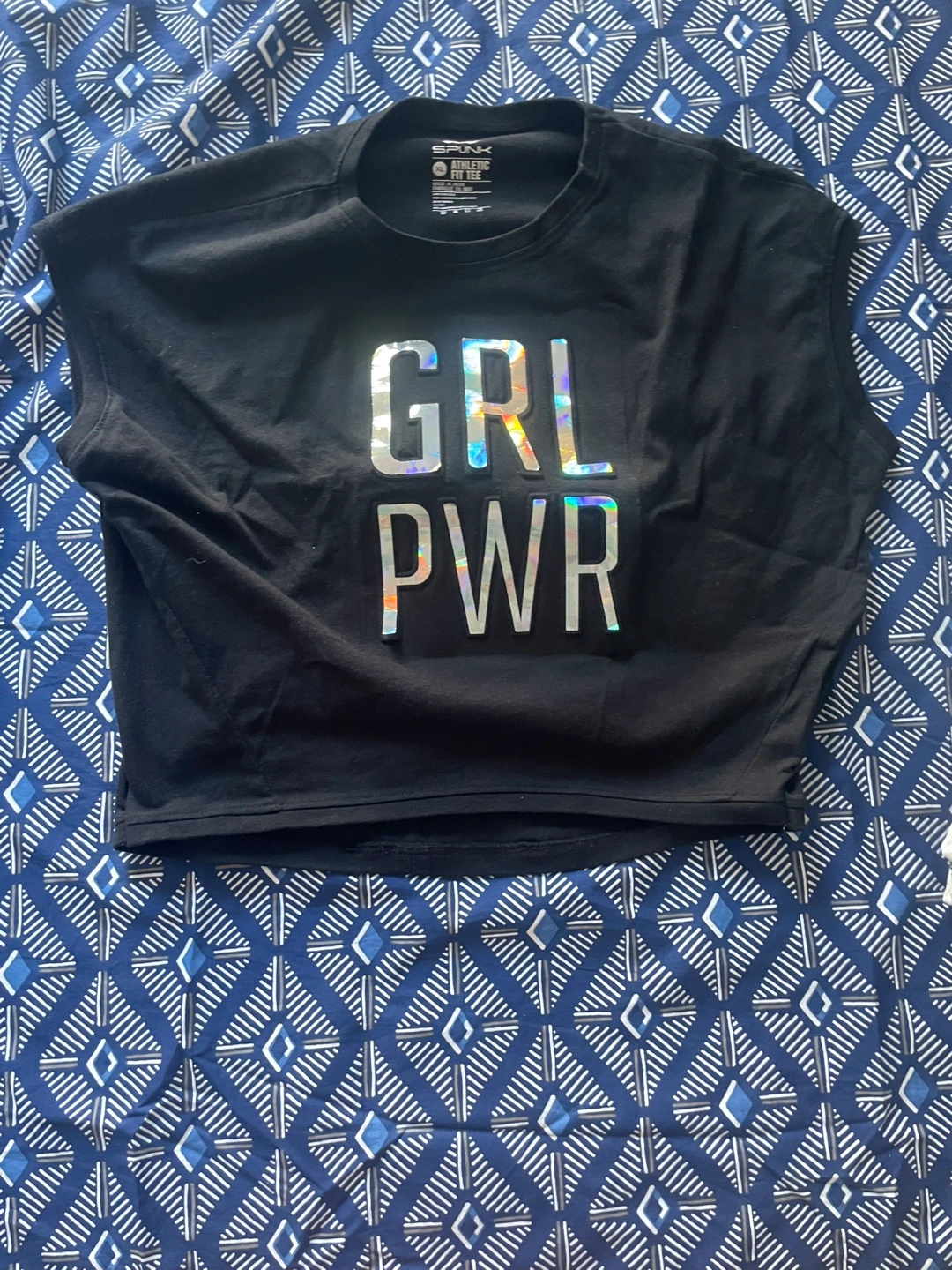 Black sleeveless cropped athletic fit tee. Features iridescent silver "GRL PWR" graphic. Excellent condition.