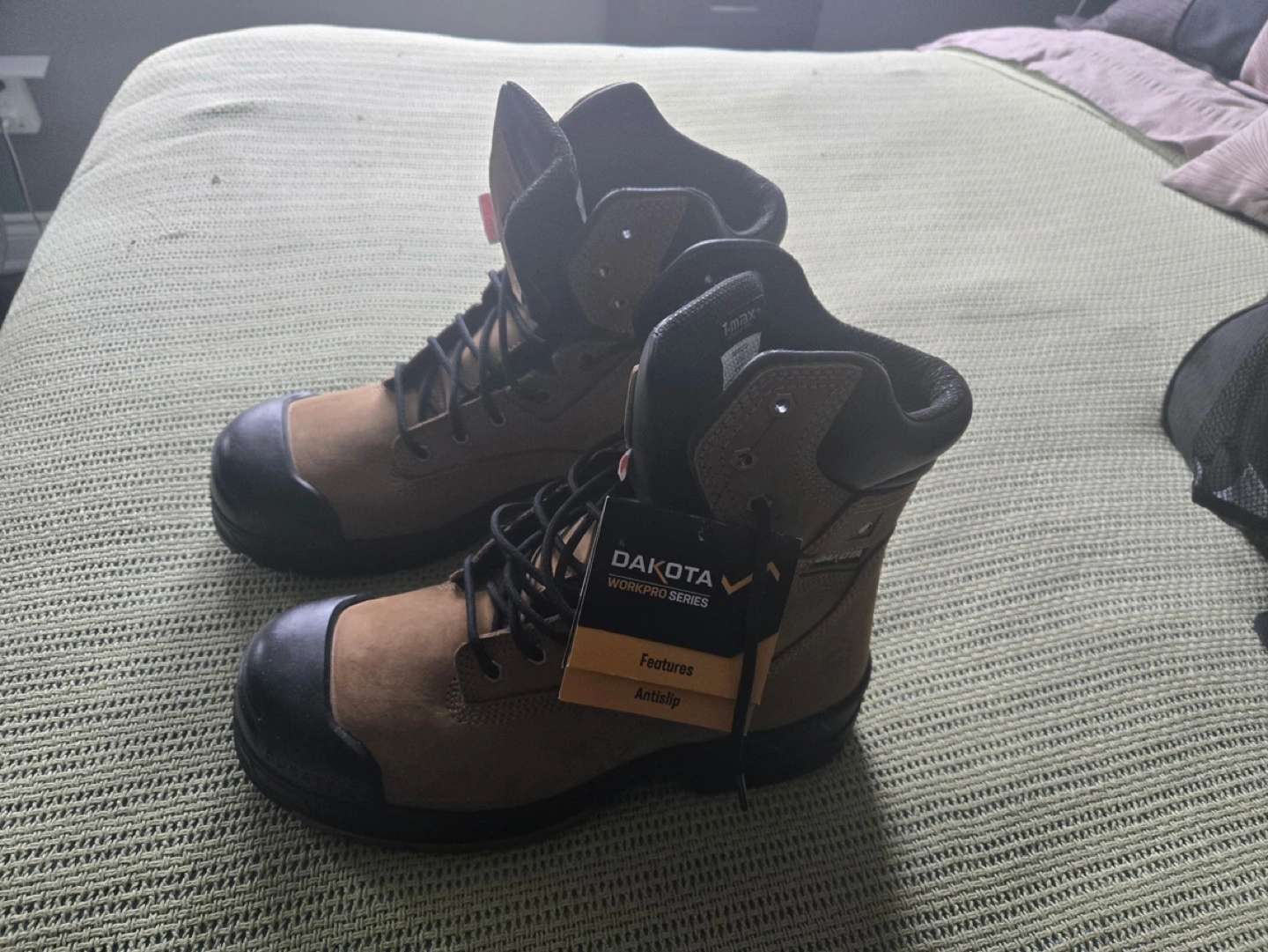 Men's Dakota WorkPro Series work boots. Tan leather upper, black accents. Size 12.0. Features anti-slip soles. T-Max insulation. Like new condition.